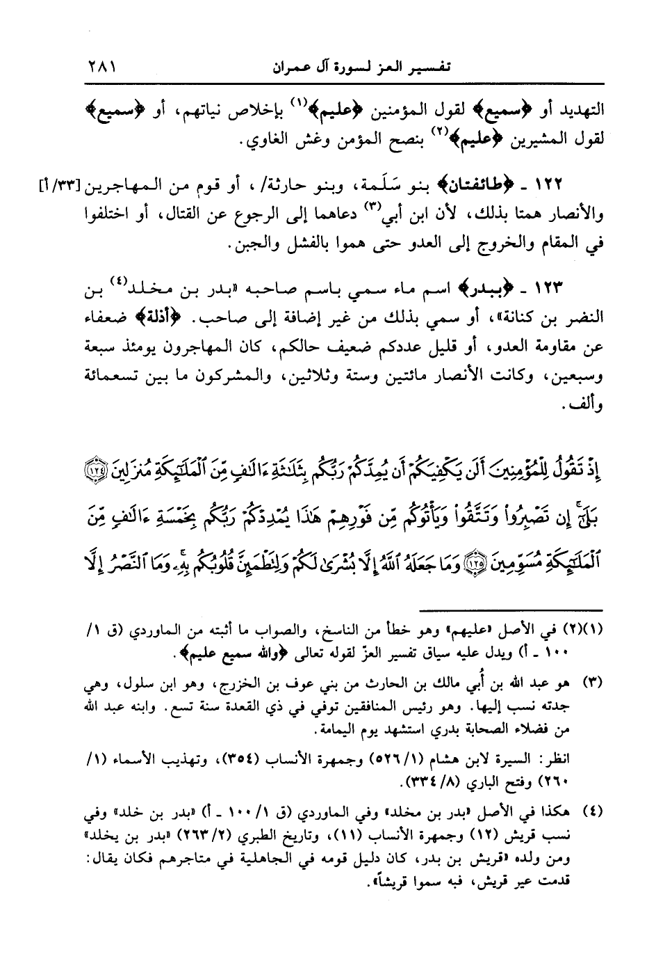 123 - {بِبَدْرٍ} اسم ماء سمي باسم صاحبه ((بدر بن مخلد بن النضر بن كنانة)) ، أو سمي بذلك من غير إضافة إلى صاحب. {أَذِلَّةٌ} ضعفاء عن مقاومة العدو، أو قليل عددكم ضعيف حالكم، كان المهاجرون يومئذ سبعة وسبعين، وكانت الأنصار مائتين وستة وثلاثين، والمشركون ما بين تسعمائة وألف. {إِذْ تَقُولُ لِلْمُؤْمِنِينَ ألن يكفيكم أن يمدكم ربكم بثلاثة آلاف من الملائكة منزلين (124) بلى إن تصبروا وتتقوا ويأتوكم من فورهم هذا يمددكم ربكم بخمسة آلاف من الملائكة مسومين (125) وما جعله الله إلا بشرى لكم ولتطمئن قلوبكم به وما النصر إلا