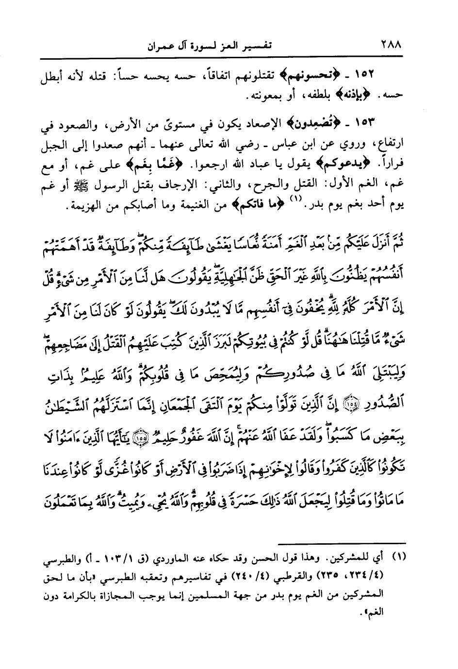 152 - {تَحُسُّونَهُم} تقتلونهم اتفاقاً، حسه يحسه حساً: قتله لأنه أبطل حسه. {بِإِذْنِهِ} بلطفه، أو بمعونته.