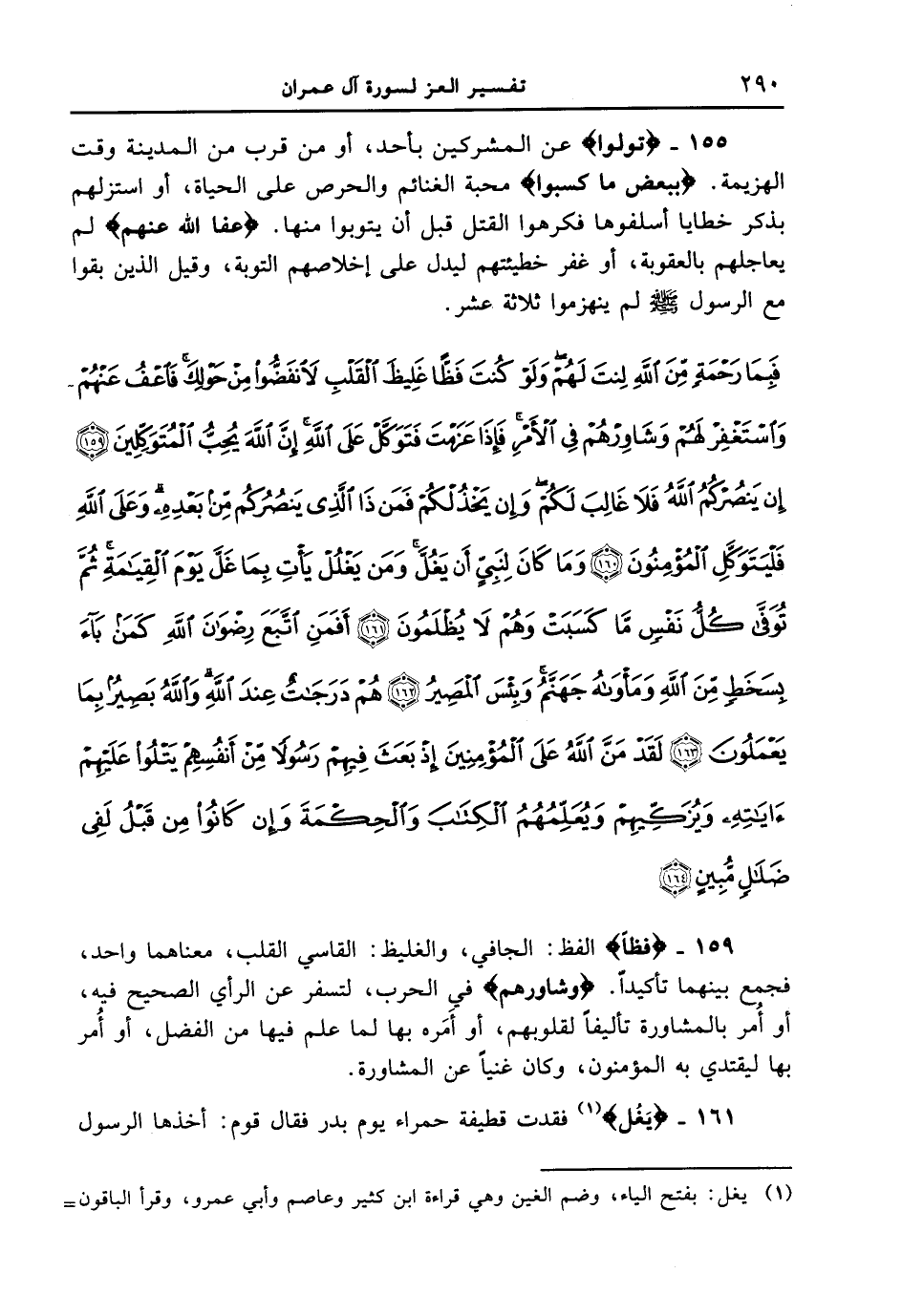 155 - {تَوَلَّوْاْ} عن المشركين بأُحد، أو من قرب من المدينة وقت الهزيمة. {بِبَعْضِ مَا كَسَبُواْ} محبة الغنائم والحرص على الحياة، أو استزلهم بذكر خطايا أسلفوها فكرهوا القتل قبل أن يتوبوا منها. {عَفَا اللهُ عَنْهُمْ} لم يعاجلهم بالعقوبة، أو غفر خطيئتهم ليدل على إخلاصهم التوبة، وقيل الذين بقوا مع الرسول صلى الله عليه وسلم لم ينهزموا ثلاثة عشر. {فبما رحمة من الله لنت لهم ولو كنت فظاً غليظ القلب لانفضوا من حولك فاعف عنهم واستغفر لهم وشاورهم في الأمر فإذا عزمت فتوكل على الله إن الله يحب المتوكلين (159) إن ينصركم الله فلا غالب لكم وإن يخذلكم فمن ذا الذي ينصركم من بعده وعلى الله فليتوكل المؤمنون (160) وما كان لنبي أن يغل ومن يغلل يأت بما غل يوم القيامة ثم توفى كل نفس ما كسبت وهم لا يظلمون (161) أفمن اتبع رضوان الله كمن بآء بسخط من الله ومأواه جهنم وبئس المصير (162) هم درجات عند الله والله بصير بما يعملون (163) لقد من الله على المؤمنين إذ بعث فيهم رسولا من أنفسهم يتلوا عليهم آياته ويزكيهم ويعلمهم الكتاب والحكمة وإن كانوا من قبل لفي ضلال مبين (164) }