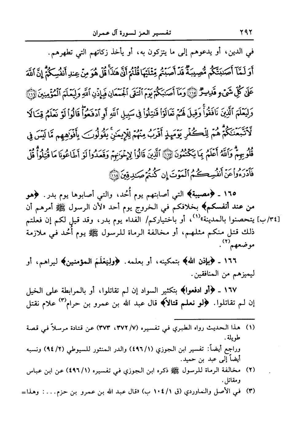 167 - {أَوِ ادْفَعُواْ} بتكثير السواد إن لم تقاتلوا، أو بالمرابطة على الخيل إن لم تقاتلوا. {لَوْ نَعْلَمُ قِتَالاً} قال عبد الله بن عمرو بن حرام علام نقتل