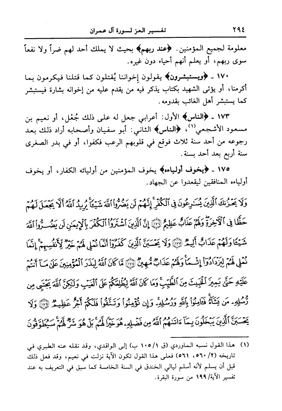 170 - {وَيَسْتَبْشِرُونَ} يقولون إِخواننا يُقتلون كما قُتلنا فيُكرمون بما أُكرمنا، أو يؤتى الشهيد بكتاب يذكر فيه من يقدم عليه من إخوانه بشارة فيستبشر كما يستبشر أهل الغائب بقدومه.
