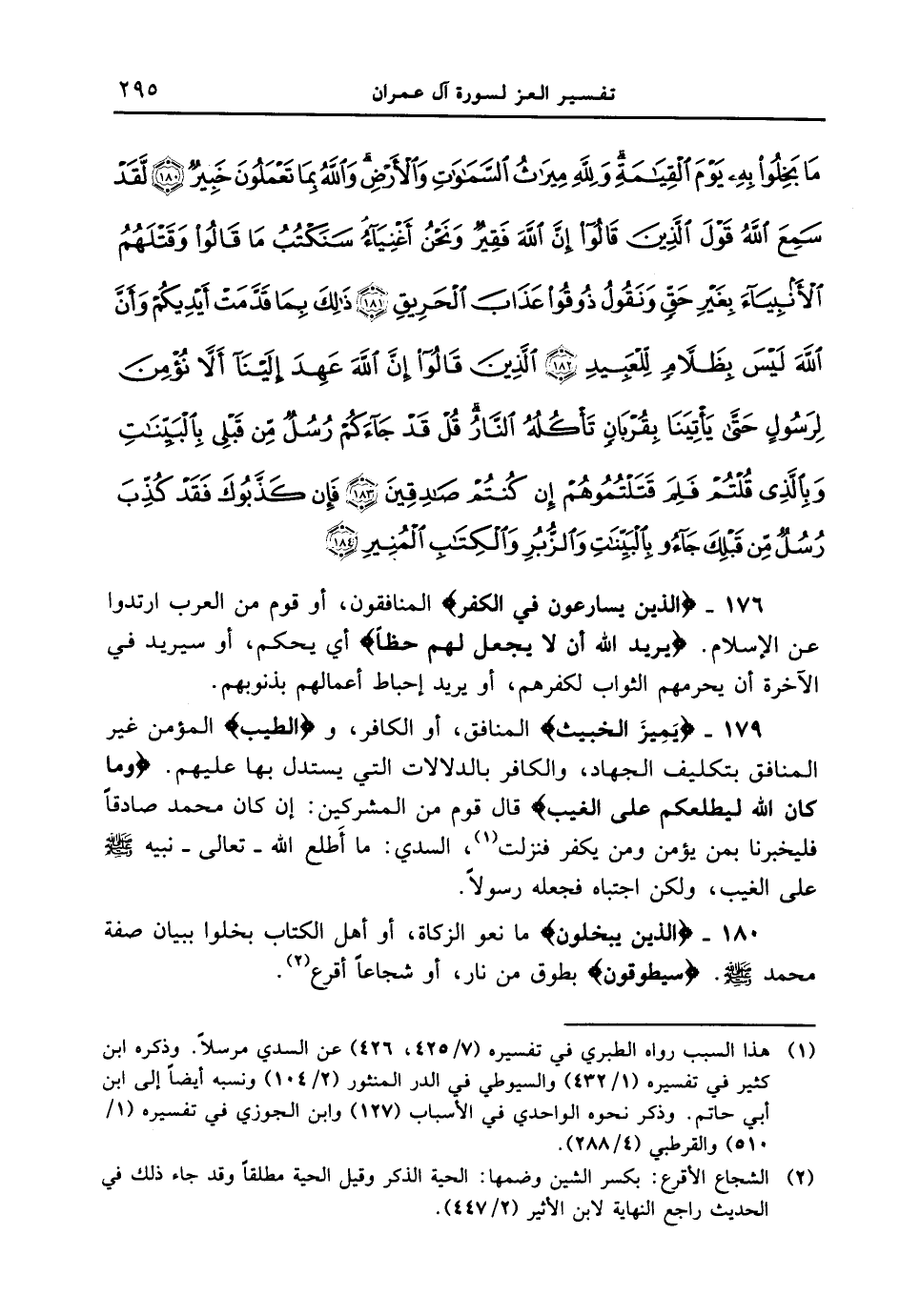 180 - {الذين يبخلون} ما نعو الزكاة، أو أهل الكتاب بخلوا ببيان صفة محمد صلى الله عليه وسلم. {سَيُطَوَّقُونَ} بطوق من نار، أو شجاعاً أقرع.
