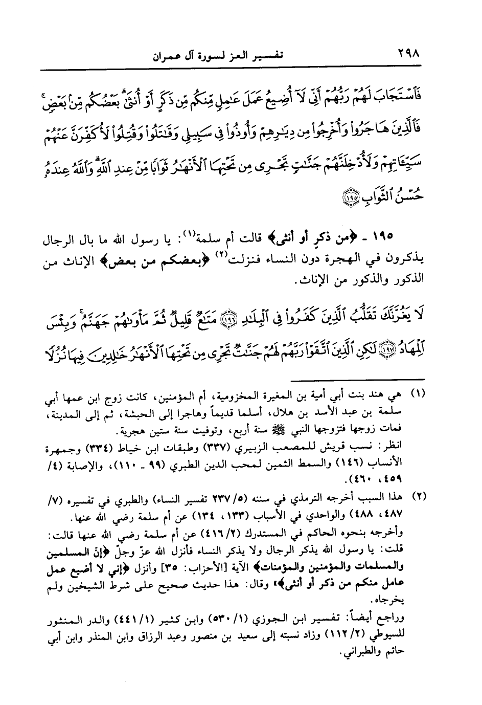 195 - {مِّن ذَكَرٍ أَوْ أُنثَى} قالت أم سلمة: يا رسول الله ما بال الرجال يذكرون في الهجرة دون النساء فنزلت {بَعْضُكُم مِّن بَعْضٍ} الإناث من الذكور والذكور من الإناث. {لا يغرنك تقلب الذين كفروا في البلاد (196) متاع قليل ثم مأواهم جهنم وبئس المهاد (197) لكن الذين اتقوا ربهم لهم جنات تجري من تحتها الأنهار خالدين فيها نزلاً