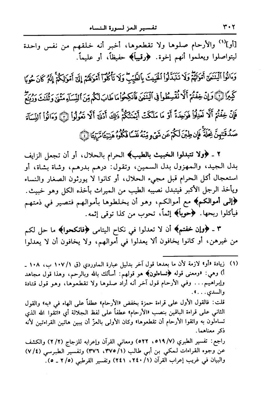 [أو] والأرحام صلوها ولا تقطعوها، أخبر أنه خلقهم من نفس واحدة ليتواصلوا ويعلموا أنهم إخوة. {رقيبا} حفيظاً، أو عليماً. {وآتوا اليتامى أموالهم ولا تتبدلوا الخبيث بالطيب ولا تأكلوا أموالهم إلى أموالكم إنه كان حوباً كبيراً (2) وإن خفتم ألا تقسطوا في اليتامى فانكحوا ما طاب لكم من النسآء مثنى وثلاث ورباع فإن خفتم ألا تعدلوا فواحدة أو ما ملكت أيمانكم ذلك أدنى ألا تعولوا (3) وءاتوا النسآء صدقاتهن نحلة فإن طبن لكم عن شيء منه نفساً فكلوه هنيئاً مريئاً (4) }