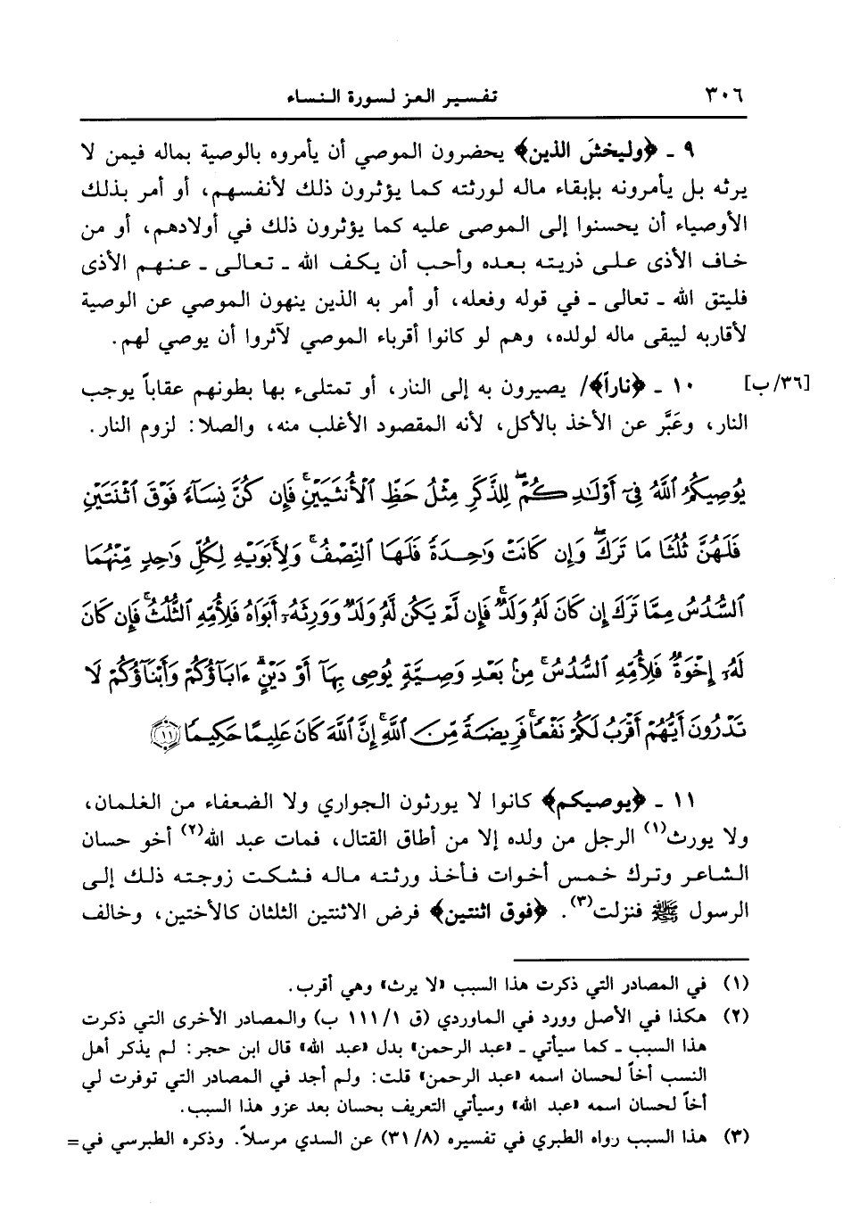 10 - {نَارًا} / يصيرون به إلى النار، أو تمتلىء بها بطونهم عقاباً يوجب النار، وعَبَّر عن الأخذ بالأكل، لأنه المقصود الأغلب منه، والصلا: لزوم النار. {يوصيكم الله في أولادكم للذكر مثل حظ الأنثيين فإن كن نسآء فوق اثنتين فلهن ثلثا ما ترك وإن كانت واحدة فلها النصف ولأبويه لكل واحد منهما السدس مما ترك إن كان له ولد فإن لم يكن له ولد وورثه أبواه فلأمه الثلث فإن كان له إخوة فلأمه السدس من بعد وصية يوصي بهآ أو دين ءابآؤكم وأبنآؤكم لا تدرون أيهم أقرب لكم نفعاً فريضة من الله إن الله كان عليما حكيما (11) }