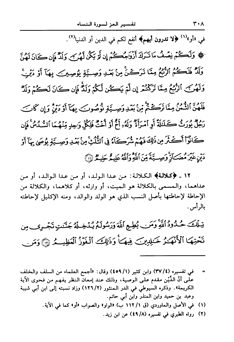 12 - {كَلالَةً} الكلالة: من عدا الولد، أو من عدا الوالد، أو من عداهما، والمسمى بالكلالة هو الميت، أو وارثه، أو كلاهما، والكلالة من الإحاطة لإحاطتها بأصل النسب الذي هو الولد والوالد، ومنه الإكليل لإحاطته بالرأس. {تلك حدود الله ومن يطع الله ورسوله يدخله جنات تجري من تحتها الأنهار خالدين فيها وذلك الفوز العظيم (13) ومن