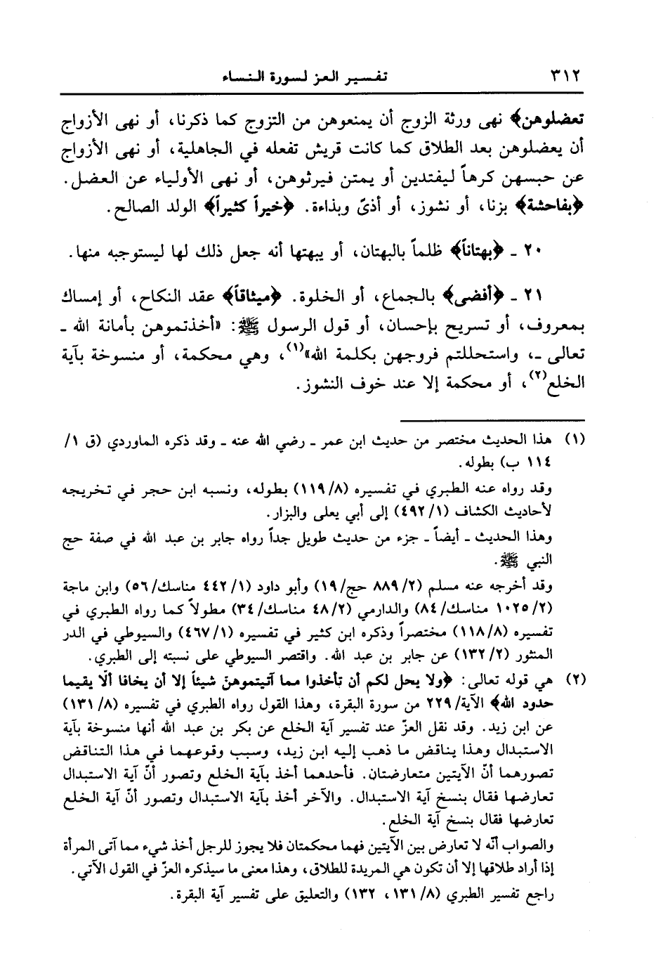 قول الرسول صلى الله عليه وسلم: " أخذتموهن بأمانة الله تعالى -، واستحللتم فروجهن بكلمة الله "، وهي محكمة، أو منسوخة بآية الخلع، أو محكمة إلا عند خوف النشوز.