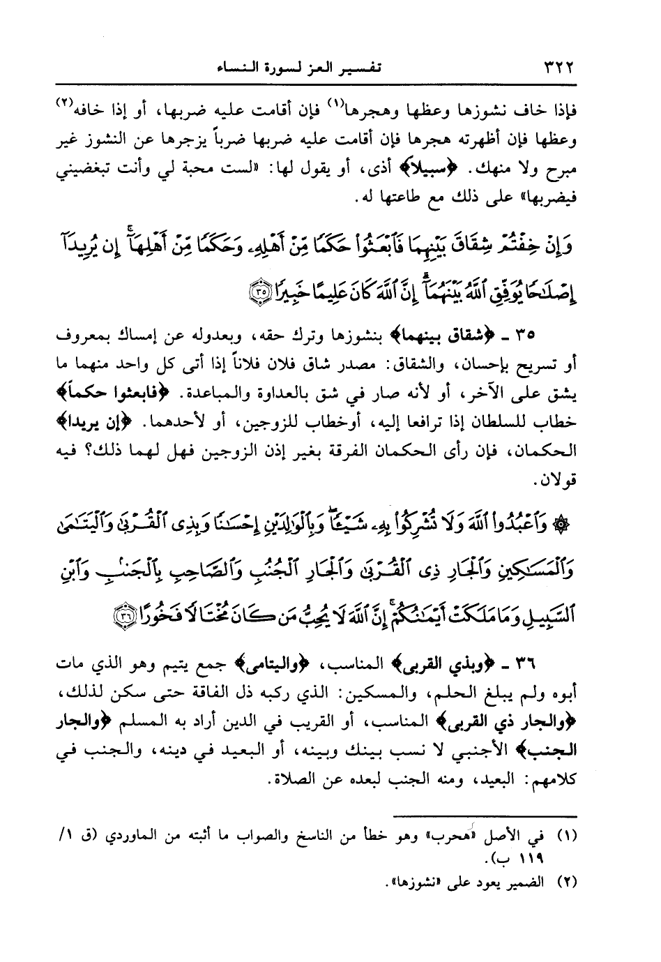 35 - {شِقَاقَ بَيْنِهِمَا} بنشوزها وترك حقه، وبعدوله عن إمساك بمعروف أو تسريح بإحسان، والشقاق: مصدر شاق فلان فلاناً إذا أتى كل واحد منهما ما يشق على الآخر، أو لأنه صار في شق بالعداوة والمباعدة. {فَابْعَثُواْ حَكَمًا} خطاب للسلطان إذا ترافعا إليه، أو خطاب للزوجين، أو لأحدهما. {إِن يُرِيدَآ} الحكمان، فإن رأى الحكمان الفرقة بغير إذن الزوجين فهل لهما ذلك؟ فيه قولان. {واعبدوا الله ولا تشركوا به شيئاً وبالوالدين إحساناً وبذي القربى واليتامى والمساكين والجار ذي القربى والجار الجنب والصاحب بالجنب وابن السبيل وما ملكت أيمانكم إن الله لا يحب من كان مختالاً فخوراً (36) }