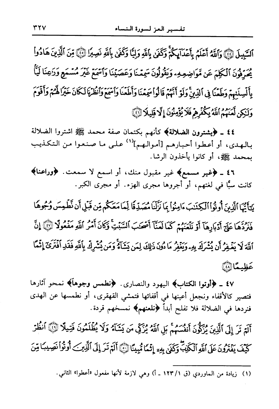 السبيل (44) والله أعلم بأعدائكم وكفى بالله وليا وكفى بالله نصيرا (45) من الذين هادوا يحرفون الكلم عن مواضعه ويقولون سمعنا وعصينا واسمع غير مسمع وراعنا ليا بألسنتهم وطعنا في الدين ولو أنهم قالوا سمعنا وأطعنا واسمع وانظرنا لكان خيرا لهم وأقوم ولكن لعنهم الله بكفرهم فلا يؤمنون إلا قليلا (46) }