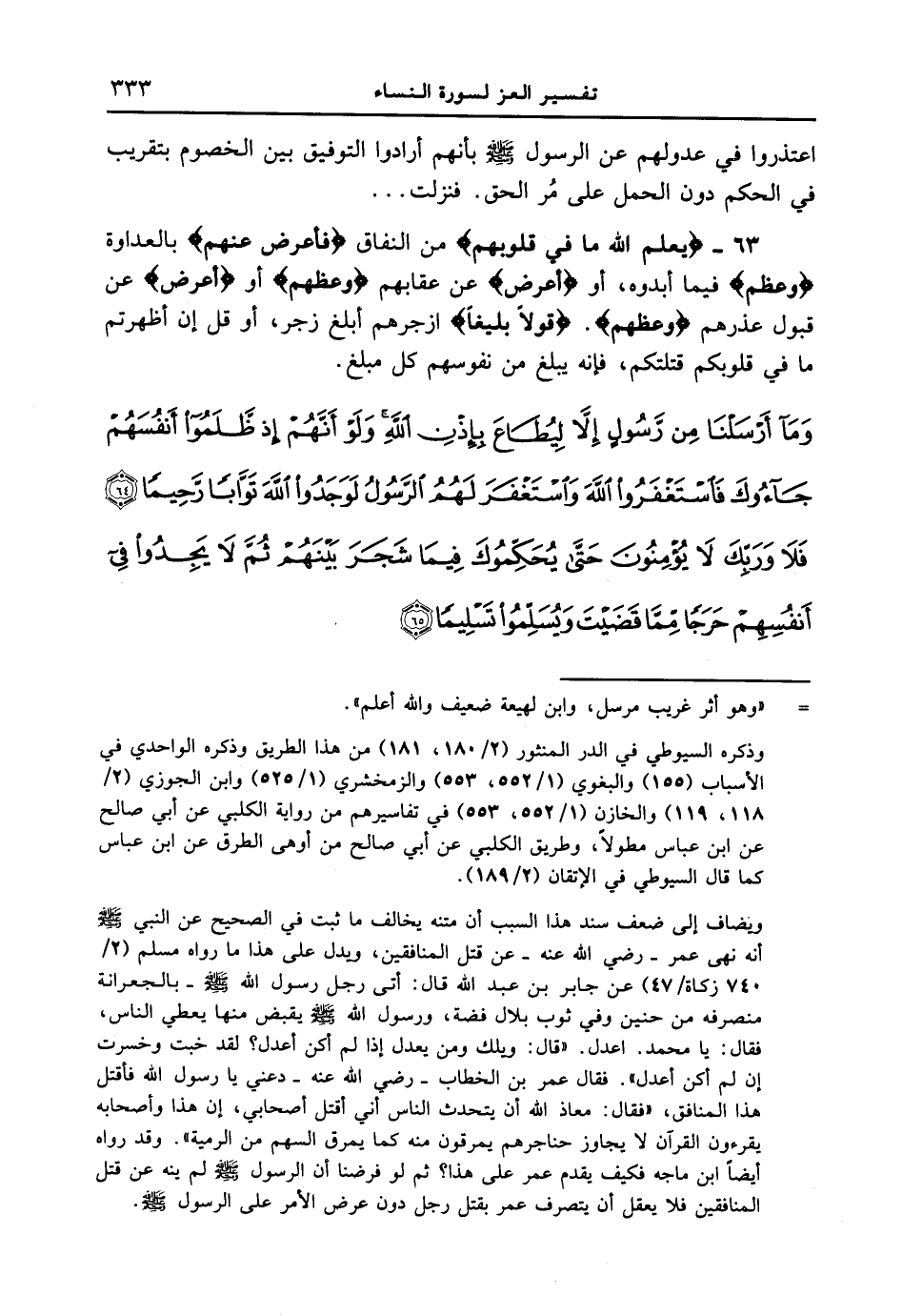 63 - = {يَعْلَمُ اللَّهُ مَا فِى قُلُوبِهِمْ} من النفاق {فأعرض عنهم} بالعداوة {وعظم} فيما أبدوه، أو {أعرض} عن عقابهم {وعظهم} أو {أعرض} عن قبول عذرهم {وَعِظْهُمْ} . {قَوْلاً بَلِيغاً} أزجرهم أبلغ زجر، أو قل إن أظهرتم ما في قلوبهم قتلتكم، فإنه يبلغ من نفوسهم كل مبلغ. {وما أرسلنا من رسول إلى ليطاع بإذن الله لو أنهم إذ ظلموا أنفسهم جاءوك فاستغفروا الله واستغفر لهم الرسول لوجدوا الله توابا رحيما (64) فلا وربك لا يؤمنون حتى يحكموك فيما شجر بينهم ثم لا يجدون في أنفسهم حرجاً مما قضيت ويسلموا تسليماً}