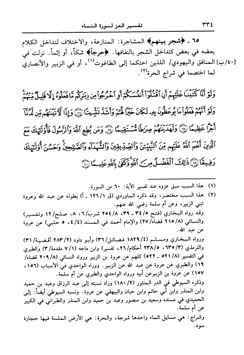 إحتكما إلى الطاغوت، أو في الزبير والأنصاري لما اختصما في شراج الحرة. {ولو أنا كتبنا عليهم أن اقتلوا أنفسكم أو اخرجوا من دياركم ما فعلوه إلا قليلا منهم ولو أنهم فعلوا ما يوعظون به لكان خيرا لهم وأشد تثبيتا (66) وإذا لآتيناهم من لدنا أجرا عظيما (67) ولهديناهم صراطا مستقيما (68) ومن يطع الله والرسول فأولائك مع الذين أنعم الله عليهم من النبيين والصديقين والشهداء والصالحين وحسن أولائك رفيقا (69) ذلك الفضل من الله وكفى بالله عليما (7) }