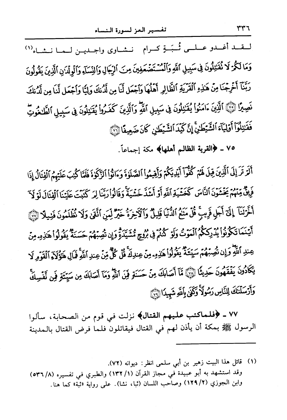 75 - {القرية الظالم أهلها} مكة إجماعاً. {ألم تر إلى الذين قيل لهم كفوآ أيديكم وأقيموا الصلاة وءاتوا الزكاة فلما كتب عليهم القتال إذا فريق منهم يخشون الناس كخشية الله أو أشد خشية وقالوا ربنا لم كتبت علينا القتال لولآ أخرتنآ إلى أجل قريب قل متاع الدنيا قليل والآخرة خير لمن اتقى ولا تظلمون فتيلا (77) أينما تكونوا يدرككم الموت ولو كنتم في بروج مشيدة وإن تصبهم حسنة يقولوا هذه من عند الله وإن تصبهم سيئة يقولوا هذه من عندك قل كل من عند الله فمال هؤلآء القوم لا يكادون يفقهون حديثا (78) مآ أصابك من حسنة فمن الله ومآ أصابك من سيئة فمن نفسك وأرسلناك للناس رسولاً وكفى بالله شهيداً (79) }