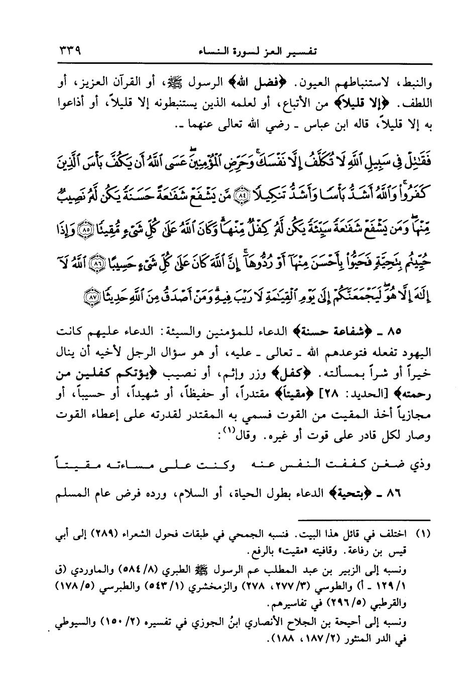 والنبط، لاستنباطهم العيون. {فضل الله} الرسول صلى الله عليه وسلم، أو القرآن العزيز، أو اللطف. {إِلاَّ قَلِيلاً} من الأتباع، أو لعلمه الذين يستنبطونه إلا قليلاً، أو أذاعوا به إلا قليلاً قاله ابن عباس - رضي الله تعالى عنهما -، {فقاتل في سبيل الله لا تكلف إلا نفسك وحرض المؤمنين عسى الله أن يكف بأس الذين كفروا والله أشد بأساً وأشد تنكيلا (84) من يشفع شفاعة حسنة يكن له نصيب منها ومن يشفع شفاعة سيئة يكن له كفل منها وكان الله على كل شيء مقيتا (85) وإذا حييتم بتحية فحيوا بأحسن منها أو ردوها إن الله كان على كل شيء حسيبا (86) الله لا إله إلا هو ليجمعنكم إلى يوم القيامة لا ريب فيه ومن أصدق من الله حديثا (87)