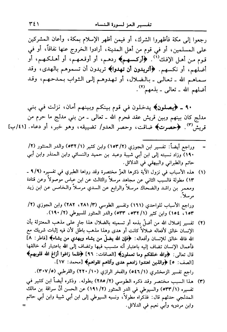 رجعوا إلى مكة فأظهروا الشرك، أو فيمن أظهر الإسلام بمكة، وأعان المشركين على المسلمين، أو في قوم من أهل المدينة، أرادوا الخروج عنها نفاقاً، أو في قوم من أهل الإفك. {أَرْكَسَهُم} ردهم، أو أوقعهم، أو أهلكهم، أو أضلهم، أو نكسهم. {أَتُرِيدُونَ أَن تَهْدُواْ} تريدون أن تسموهم بالهدى، وقد سماهم الله - تعالى - بالضلال أو تهدوهم إلى الثواب بمدحهم، وقد أضلهم الله - تعالى - بذمهم.