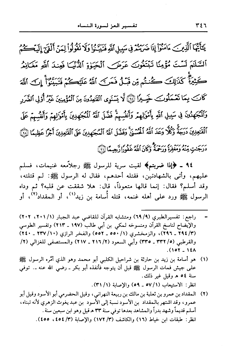 {يآ أيها الذين ءامنوا إذا ضربتم في سبيل الله فتبينوا ولا تقولوا لمن ألقى إليكم السلام لست مؤمناً تبتغون عرض الحياة الدنيا فعند الله مغانم كثيرة كذلك كنتم من قبل فمن الله عليكم فتبينوا إن الله كان بما تعملون خبيراً (94) لا يستوي القاعدون من المؤمنين غير أولي الضرر والمجاهدون في سبيل الله بأموالهم وأنفسهم فضل الله المجاهدين بأموالهم وأنفسهم على القاعدين درجة وكلاً وعد الله الحسنى وفضل المجاهدين على القاعدين أجراً عظيماً (95) درجات منه ومغفرة ورحمة وكان الله غفوراً رحيماً (96) }