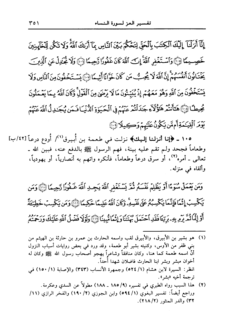 105 - {إِنَّآ أَنزَلْنَآ إِلَيْكَ} نزلت في طعمة بن أُبيرق / أُودع درعاً وطعاماً فجحد ولم تقم عليه بينة، فهم الرسول صلى الله عليه وسلم بالدفع عنه، فبين الله - تعالى - أمره، أو سرق درعاً وطعاماً، فأنكره واتهم به أنصارياً، أو يهودياً، وألقاه في منزله. {ومن يعمل سوءاً أو يظلم نفسه ثم يستغفر الله يجد الله غفوراً رحيماً (110) ومن يكسب إثماً فإنما يكسبه على نفسه وكان الله عليماً حكيماً (111) ومن يكسب خطيئة أو إثماً ثم يرم به بريئاً فقد احتمل بهتاناً وإثماً مبيناً (112) ولولا فضل الله عليك ورحمته