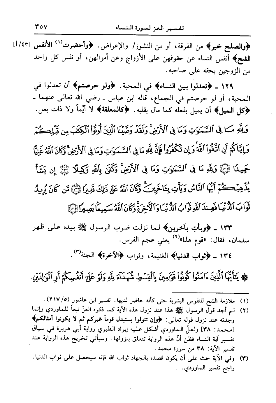 129 - {تَعْدِلُواْ بَيْنَ النِّسَآءِ} في المحبة. {وَلَوْ حَرَصْتُمْ} أن تعدلوا في المحبة، أو لو حرصتم في الجماع، قاله ابن عباس - رضي الله تعالى عنهما - {كُلَّ الْمَيْلِ} أن يميل بفعله كما مال بقلبه. {كَالْمُعَلَّقَةِ} لا أيِّماً ولا ذات بعل. {ولله ما في السماوات ومافي الأرض ولقد وصينا الذين أوتو الكتاب من قبلكم وإياكم أن اتقوا الله وإن تكفروا فإن لله ما في السماوات وما في الأرض وكان الله غنيا حميدا (131) ولله ما في السماوات وما في الأرض وكفى بالله وكيلا (132) إن يشأ يذهبكم أيها الناس ويأت بآخرين وكان الله على ذلك قديرا (133) من كان يريد ثواب الدنيا فعند الله ثواب الدنيا والأخرة وكان الله سميعا بصيرا (134)