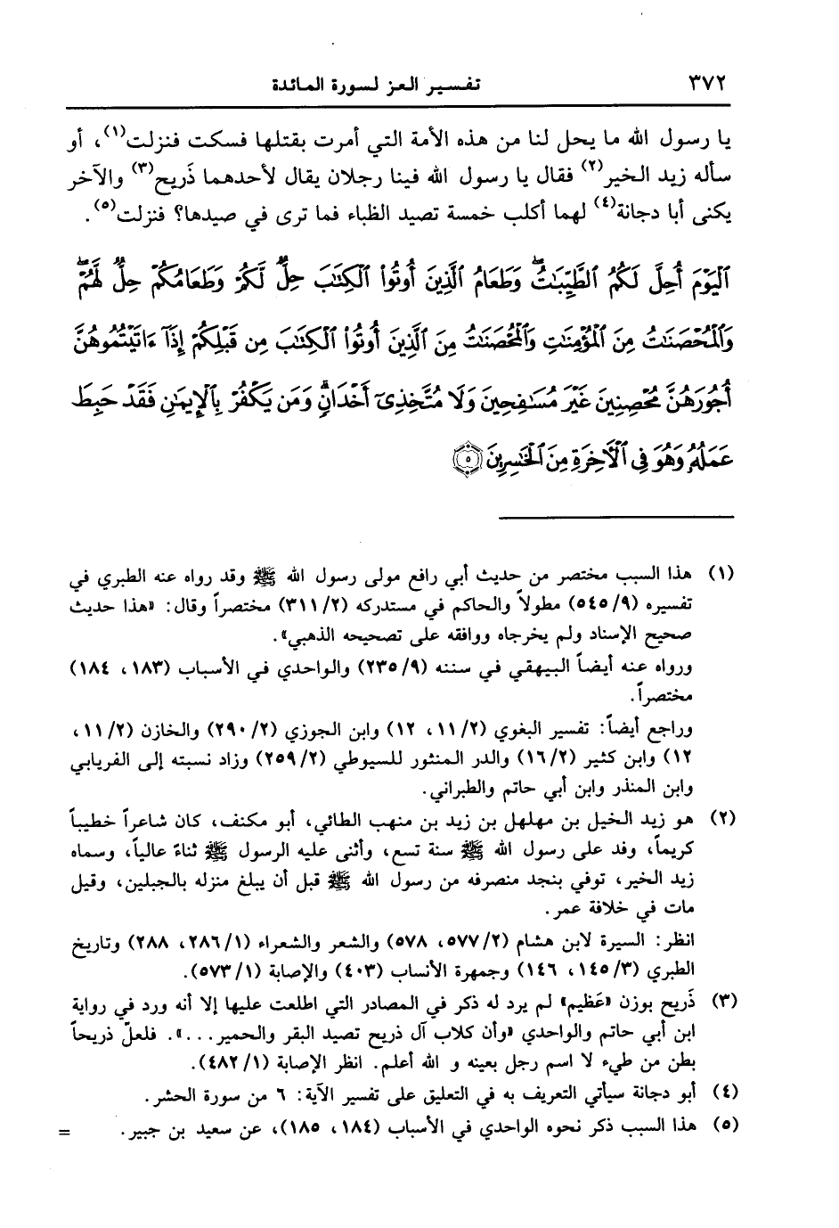 يا رسول الله ما يحل لنا من هذه الأمة التي أمرت بقتلها فسكت فنزلت، أو سأله زيد الخير فقال يا رسول الله فينا رجلان يقال لأحدهما ذَريح والآخر يكنى أبا دجانة لهما أكلب خمسة تصيد الظباء فما ترى في صيدها؟ فنزلت. {اليوم أحل لكم الطيبات وطعام الذين أوتوا الكتاب حل لكم وطعامكم حل لهم والمحصنات من المؤمنات والمحصنات من الذين أوتوا الكتاب من قبلكم إذآ ءاتيتموهن أجورهن محصنين غير مسافحين ولا متخذي أخدان ومن يكفر بالإيمان فقد حبط عمله وهو في الآخرة من الخاسرين (5) }