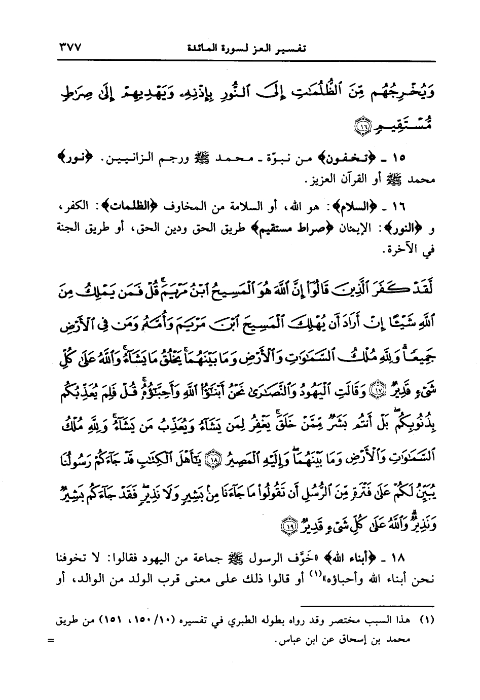 16 - {السَّلامِ} : هو الله، أو السلامة من المخاوف {الظُّلُمَاتِ) {الكفر و} (النُّورِ) {الإيمان} (صِرَاطٍ مُّسْتَقِيمٍ} طريق الحق ودين الحق، أو طريق الجنة في الآخرة. {لقد كفر الذين قالوا إن الله هو المسيح ابن مريم قل فمن يملك من الله شيئا إن أراد أن يهلك المسيح ابن مريم وأمه ومن في الأرض جميعا ولله ملك السماوات والأرض وما بينهما يخلق ما يشآء والله على كل شيء قدير (17) وقالت اليهود والنصارى نحن أبناء الله وأحباؤه قل فلم يعذبكم بذنوبكم بل أنتم بشر ممن خلق يغفر لمن يشآء ويعذب من يشآء ولله ملك السماوات والأرض وما بينهما وإليه المصير (18) يآ أهل الكتاب قد جآءكم رسولنا يبين لكم على فترة من الرسل أن تقولوا ما جآءنا من بشير ولا نذير فقد جآءكم بشير ونذير والله على كل شيء قدير (19) }