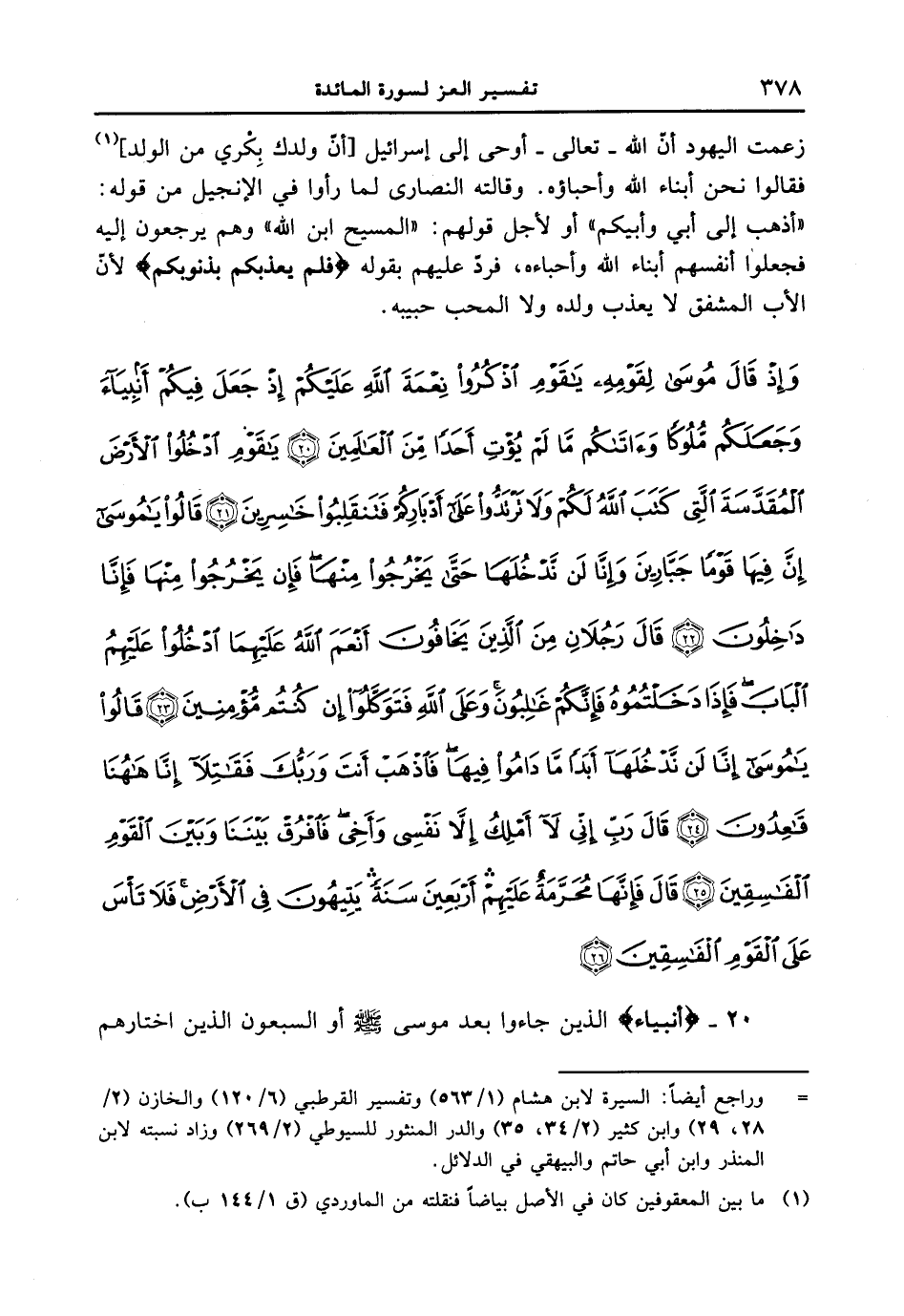 زعمت اليهود أنّ الله - تعالى - أوحى إلى إسرائيل [أنّ ولدك بِكْري من الولد] فقالوا نحن أبناء الله وأحباؤه. وقالته النصارى لما رأوا في الإنجيل من قوله: " أذهب إلى أبي وأبيكم " أو لأجل قولهم: " المسيح ابن الله " وهم يرجعون إليه فجعلوا أنفسهم أبناء الله وأحباءه، فردّ عليهم بقوله {فَلِمَ يُعَذِّبُكُم بِذُنُوبِكُم} لأن الأب المشفق لا يعذب ولده ولا المحب حبيبه. {وإذ قال موسى لقومه يا قوم اذكروا نعمة الله عليكم إذ جعل فيكم أنبيآء وجعلكم ملوكاً وءاتاكم ما لم يؤت أحداً من العالمين (20) يا قوم ادخلوا الأرض المقدسة التي كتب الله لكم ولا ترتدوا على أدباركم فتنقلبوا خاسرين (21) قالوا يا موسى إن فيها قوماً جبارين وإنا لن ندخلها حتى يخرجوا منها فإن يخرجوا منها فإنا داخلون (22) قال رجلان من الذين يخافون أنعم الله عليهما ادخلوا عليهم الباب فإذا دخلتموه فإنكم غالبون وعلى الله فتوكلوآ إن كنتم مؤمنين (23) قالوا يا موسى إنا لن ندخلهآ أبداً ما داموا فيها فاذهب أنت وربك فقاتلآ إنا هاهنا قاعدون (24) قال رب إني لآ أملك إلا نفسي وأخي فافرق بيننا وبين القوم الفاسقين (25) قال فإنها محرمة عليهم أربعين سنة يتيهون في الأرض فلا تأس على القوم الفاسقين (26) }