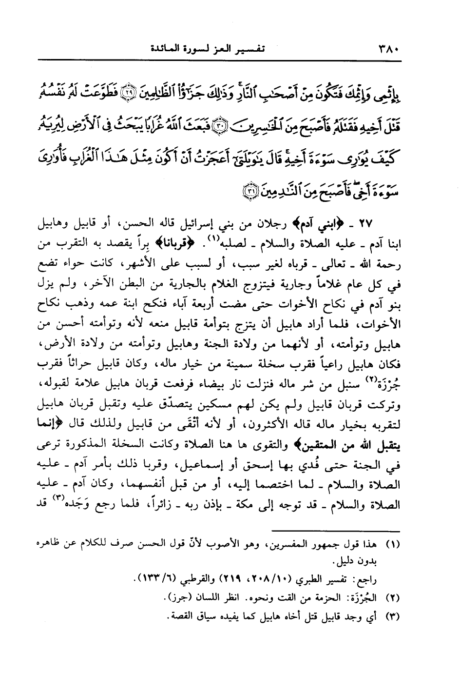 27 - {ابني آدم} رجلان من بني إسرائيل قاله الحسن، أو قابيل وهابيل ابنا آدم - عليه الصلاة والسلام - لصلبه. {قُرْبَاناً} بِراً يقصد به التقرب من رحمة الله - تعالى - قرباه لغير سبب، أو لسبب على الأشهر، كانت حواء تضع في كل عام غلاماً وجارية فيتزوج الغلام بالجارية من البطن الآخر، ولم يزل بنو آدم في نكاح الأخوات حتى مضت أربعة آباء فنكح ابنة عمه وذهب نكاح الأخوات، فلما أراد هابيل أن يتزج بتوأمة قابيل منعه لأنه وتوأمته أحسن من هابيل وتوأمته، أو لأنهما من ولادة الجنة وهابيل وتوأمته من ولادة الأرض، فكان هابيل راعياً فقرب سخلة سمينة من خيار ماله، وكان قابيل حراثاً فقرب جُرْزَة سنبل من شر ماله فنزلت نار بيضاء فرفعت قربان هابيل علامة لقبوله وتركت قربان قابيل ولم يكن