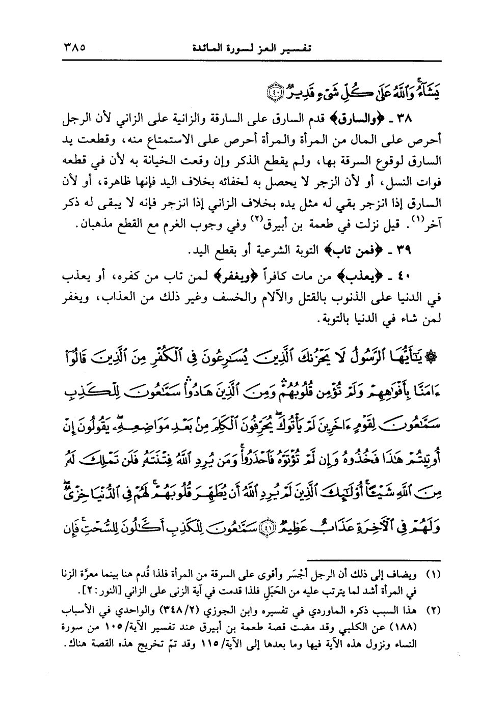 38 - {وَالسَّارِقُ} قدم السارق على السارقة والزانية على الزاني لان الرجل أحرص على المال من المرأة والمرأة أحرص على الاستمتاع منه، وقطعت يد السارق لوقوع السرقة بها، ولم يقطع الذكر وإن وقعت الخيانة به لأن في قطعه فوات النسل، أو لأن الزجر لا يحصل به لخفائه بخلاف اليد فإنها ظاهرة، أو لأن السارق إذ اانزجر بقي له مثل يده بخلاف الزاني إذا انزجر فإنه لا يبقى له ذكر آخر. قيل نزلت في طعمة بن أبيرق وفي وجوب الغرم مع القطع مذهبان