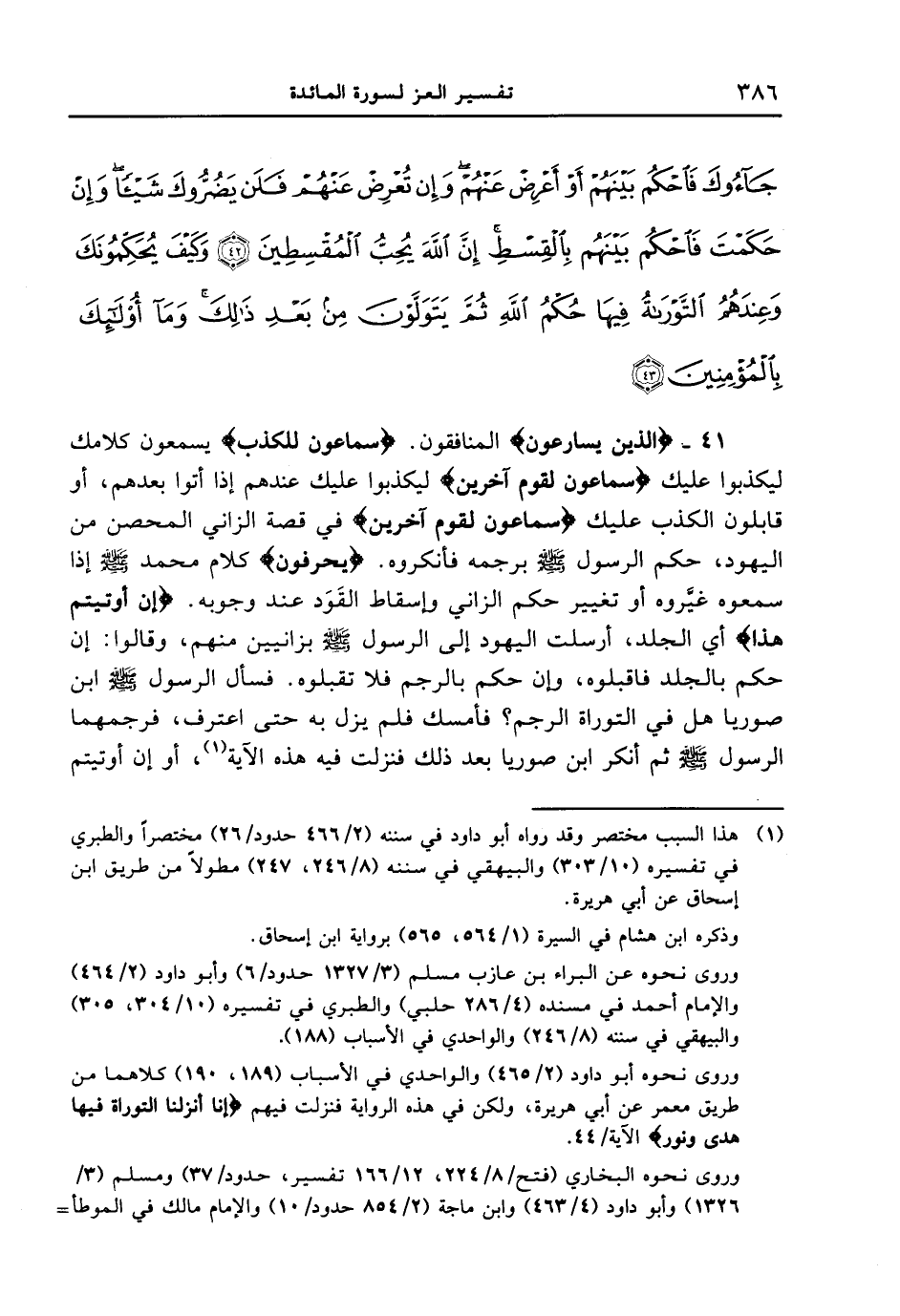 41 - {الَّذِينَ يُسَارِعُونَ) {المنافقون} (سَمَّاعُونَ لِلْكَذِبِ} يسمعون كلامك ليكذبوا عليك {سماعون لقوم آخرين} ليكذبوا عليك عندهم إذا أتوا بعدهم، أو قابلون الكذب عليك {سماعون لقوم آخرين} في قصة الزاني المحصن من اليهود، حكم الرسول صلى الله عليه وسلم برجمه فأنكروه. {يحرفون} كلام محمد صلى الله عليه وسلم إذا سمعوه غيَّروه أو تغيير حكم الزاني وإسقاط القَوَد عند وجوبه. {إِنْ أُوتِيتُمْ هَذَا} أي الجلد، أرسلت اليهود إلى الرسول صلى الله عليه وسلم بزانيين منهم، وقالوا: إن حكم بالجلد فاقبلوه، وإن حكم بالرجم فلا تقبلوه. فسأل الرسول صلى الله عليه وسلم ابن صوريا هل في التوراة الرجم؟ فأمسك فلم يزل به حتى اعترف، فرجمهما الرسول صلى الله عليه وسلم ثم أنكر ابن صوريا بعد ذلك فنزلت فيه هذه الآية، أو إن أوتيتم