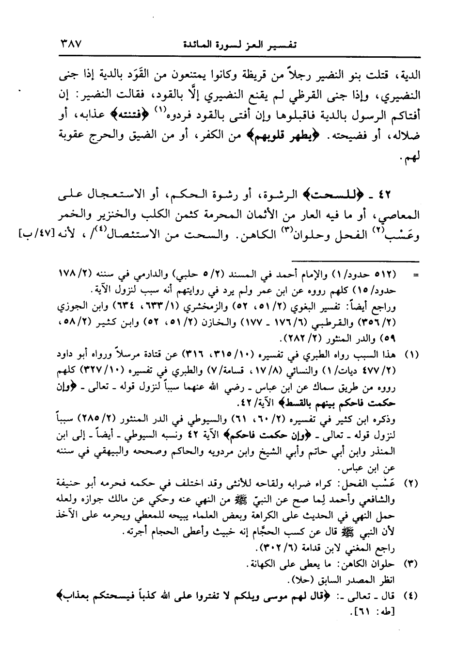 42 - {لِلسُّحْتِ} الرشوة، أو رشوة الحكم، أو الاستعجال على المعاصي، أو ما فيه العار من الأثمان المحرمة كثمن الكلب والخنزير والخمر وعَسْب الفحل وحلوان الكاهن. والسحت من الاستئصال /، لأنه
