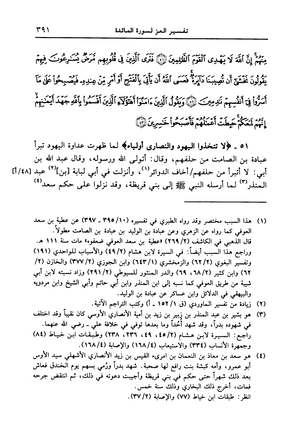 51 - {لا تَتَّخِذُواْ الْيَهُودَ وَالنَّصَارَى أَوْلِيَآءَ} لما ظهرت عداوة اليهود تبرأ عبادة بن الصامت من حلفهم، وقال: أتولى الله ورسوله، وقال عبد الله بن أُبي: لا أتبرأ من حلفهم / أخاف الدوائر، وأنزلت في أبي لبابة [بن] عبد المنذر لما أرسله النبي صلى الله عليه وسلم إلى بني قريظة، وقد نزلوا على حكم سعد