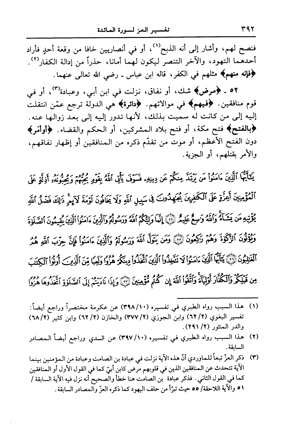 52 - {مَّرَضٌ} شك، أو نفاق، نزلت في ابن أُبي، وعبادة، أو في قوم منافقين. {فِيهِمْ} في موالاتهم. {دَآئِرَةٌ} هي الدولة ترجع عمّن انتقلت إليه إلى من كانت له سميت بذلك، لأنها تدور إليه إلى بعد زوالها عنه. {بِالْفَتْحِ} فتح مكة، او فتح بلاد المشركين، أو الحكم والقضاء. {أَوْ أمْرٍ} دون الفتح الأعظم، أو موت من تقدّم ذكره من المنافقين أو إظهار نفاقهم، والأمر بقتلهم، أو الجزية. {يآ أيها الذين ءامنوا من يرتد منكم عن دينه فسوف يأتي الله بقوم يحبهم ويحبونه أذلة على المؤمنين أعزة على الكافرين يجاهدون في سبيل الله ولا يخافون لومة لآئم ذلك فضل الله يؤتيه من يشآء والله واسع عليم (54) إنما وليكم الله ورسوله والذين ءامنوا الذين يقيمون الصلاة ويؤتون الزكاة وهم راكعون (55) ومن يتول الله ورسوله والذين ءامنوا فإن حزب الله هم الغالبون (56) يآ أيها الذين ءامنوا لا تتخذوا الذين اتخذوا دينكم هزواً ولعباً من الذين أوتوا الكتاب من قبلكم والكفار أوليآء واتقوا الله إن كنتم مؤمنين (57) وإذا ناديتم إلى الصلاة اتخذوها هزواً