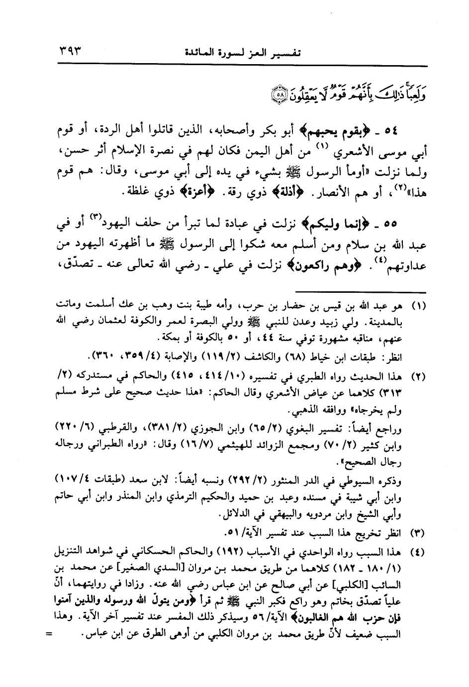 55 - {إِنَّمَا وَلِيُّكُمُ} نزلت في عبادة لما تبرأ من حلف اليهود أو في عبد الله بن سلام ومن أسلم معه شكوا إلى الرسول صلى الله عليه وسلم ما أظهرته اليهود من عداوتهم. {وَهُمْ رَاكِعُونَ} نزلت في علي - رضي الله تعالى عنه - تصدق،