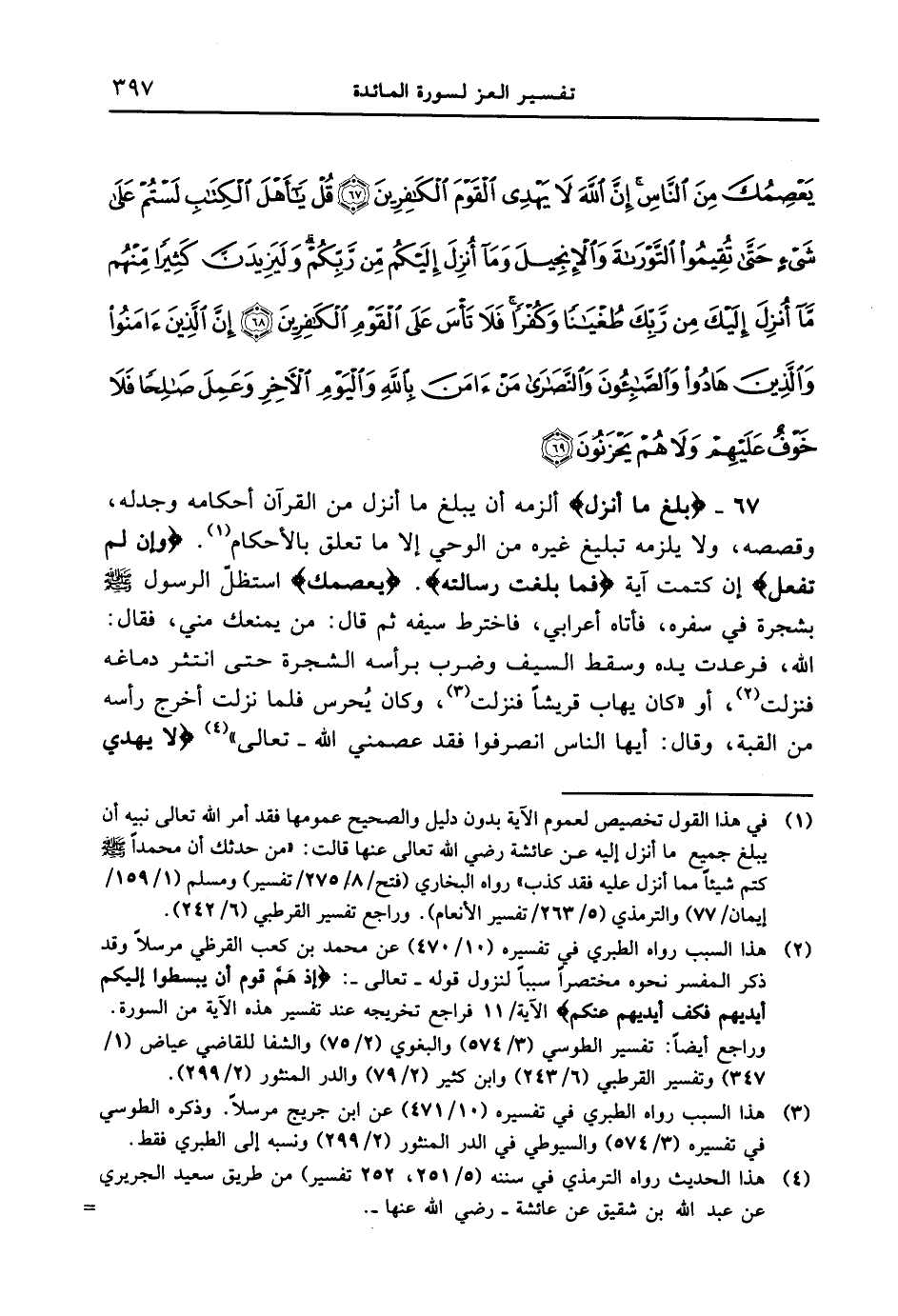 67 - {بَلِّغْ مَآ أُنزِلَ} ألزمه أن يبلغ ما أنزل من القرآن أحكامه وجدله، وقصصه، ولا يلزمه تبليغ غيره من الوحي إلا ما تعلق بالأحكام. {وَإِن لَّمْ تَفْعَلْ} إن كتمت أية {فَمَا بَلَّغْتَ رِسَالَتَهُ} . {يَعْصِمُكَ} أستظلّ الرسول صلى الله عليه وسلم بشجرة في سفره، فأتاه أعرابي، فاخترط سيفه ثم قال: من يمنعك مني، فقال: الله، فرعدت يده وسقط السيف وضرب برأسه الشجرة حتى انتثر دماغه فنزلت، أو " كان يهاب قريشاً فنزلت، وكان يُحرس فلما نزلت أخرج رأسه من القبة، وقال: أيها الناس انصرفوا فقد عصمني الله - تعالى " {لا يَهْدِى