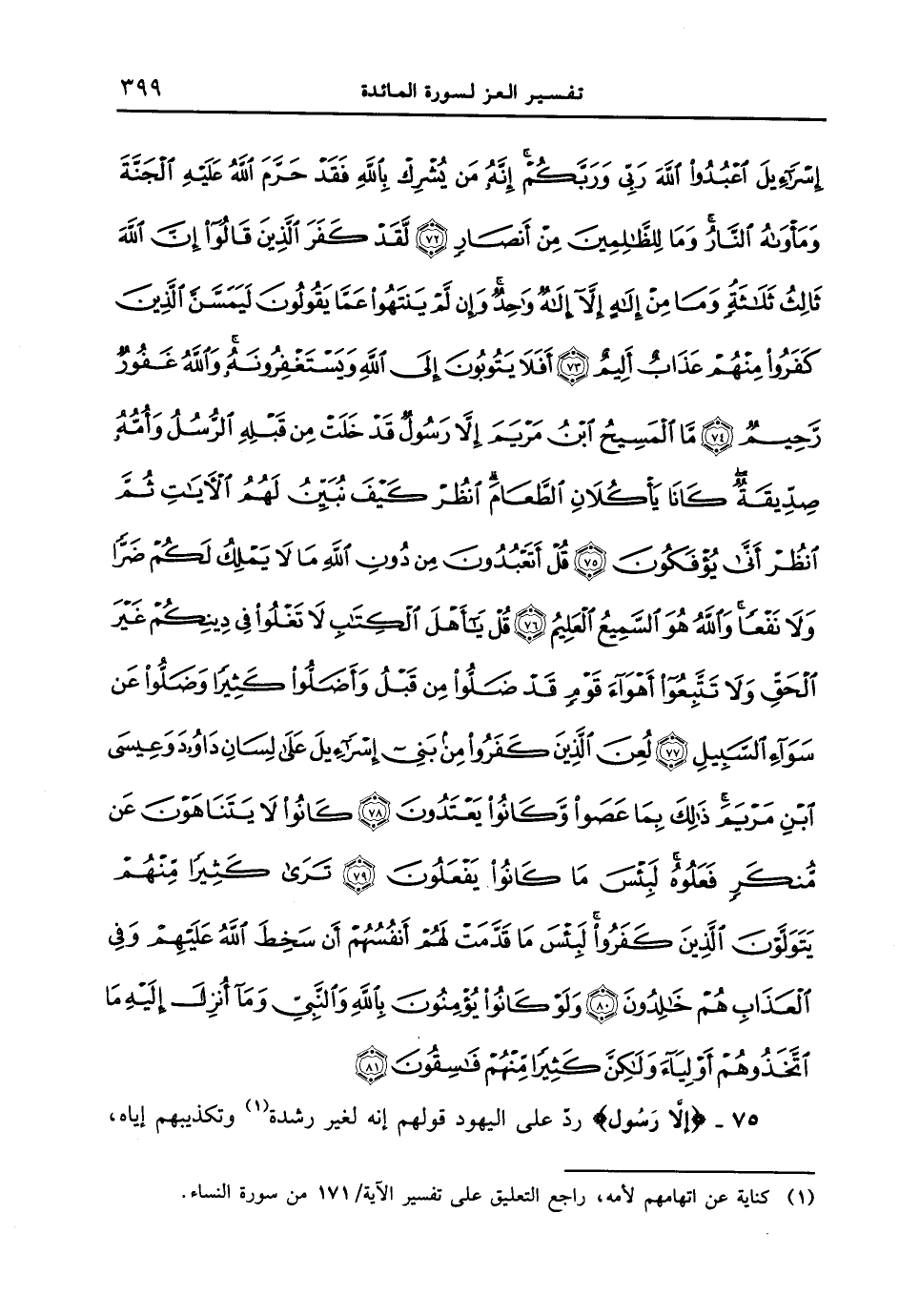 إسرآءيل اعبدوا الله ربي وربكم إنه من يشرك بالله فقد حرم الله عليه الجنة ومأواه النار وما للظالمين من أنصار (72) لقد كفر الذين قالوا إن الله ثالث ثلاثة وما من إله إلا إله واحد وإن لم ينتهوا عما يقولون ليمسن الذين كفروا منهم عذاب أليم (73) أفلا يتوبون إلى الله ويستغفرونه والله غفور رحيم (74) ما المسيح ابن مريم إلا رسول قد خلت من قبله الرسل وأمه صديقة كانا يأكلان الطعام انظر كيف نبين لهم الآيات ثم انظر أنى يؤفكون (75) قل أتعبدون من دون الله ما لا يملك لكم ضرّاً ولا نفعاً والله هو السميع العليم (76) قل يآ أهل الكتاب لا تغلوا في دينكم غير الحق ولا تتبعوا أهوآء قوم قد ضلوا من قبل وأضلوا كثيرا وضلوا عن سوآء السبيل (77) لعن الذين كفروا من بني إسرآءيل على لسان داود وعيسى ابن مريم ذلك بما عصوا ووكانوا يعتدون (78) كانوا لا يتناهون عن منكر فعلوه لبئس ما كانوا يفعلون (79) ترى كثيراً منهم يتولون الذين كفروا لبئس ما قدمت لهم أنفسهم أن سخط الله عليهم وفي العذاب هم خالدون (80) ولو كانوا يؤمنون بالله والنبي ومآ أنزل إليه ما اتخذوهم أوليآء ولكن كثيراً منهم فاسقون (81) }
