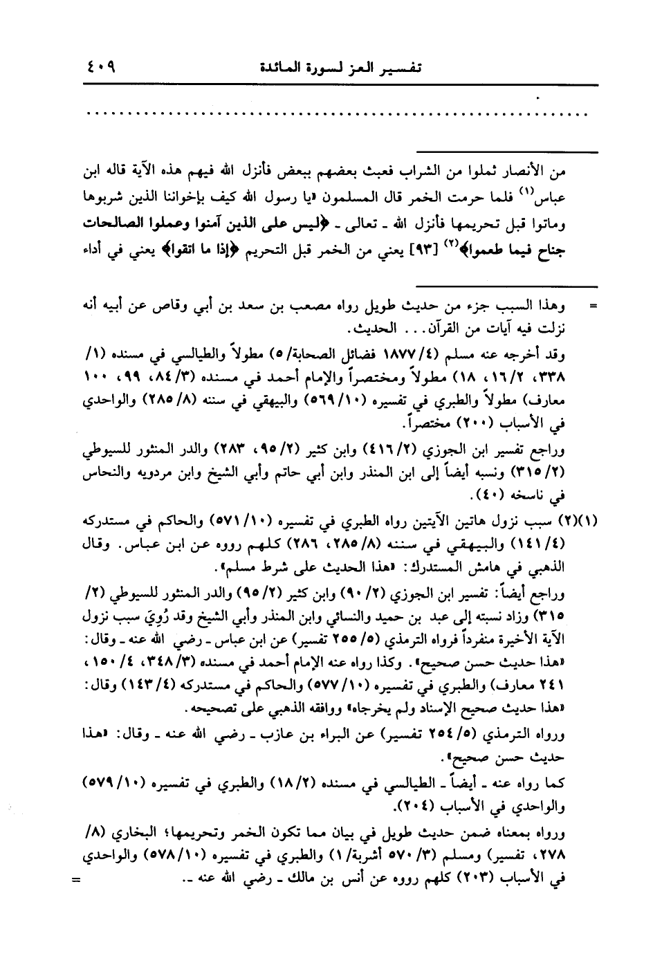 .. ... ... ... ... ... ... . . من الأنصار ثملوا من الشراب فعبث بعضهم ببعض فأنزل الله فيهم هذه الآية قاله ابن عباس فلما حرمت الخمر قال المسلمون ((يا رسول الله كيف بأخواننا الذين شربوها وماتوا قبل تحريمها فأنزل الله - تعالى - {لَيْسَ عَلَى الذين آمَنُواْ وَعَمِلُواْ الصالحات جُنَاحٌ فِيمَا طمعوا} [93] يعني من الخمر قبل التحريم {إِذَا مَا اتقوا} يعني في أداء