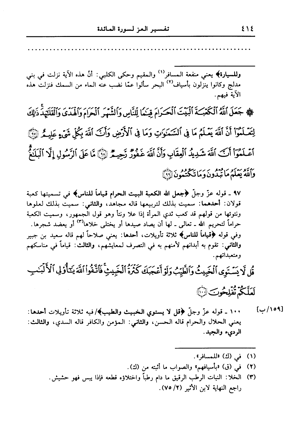 .. ... ... ... ... ... ... . . وَلِلسَّيَّارَةِ} يعني منفعة المسافر والمقيم وحكى الكلبي: أنّ هذه الآية نزلت في بني مدلج وكانوا ينزلون بأسياف البحر سألوا عمّا نضب عنه الماء من السمك فنزلت هذه الآية فيهم. {جَعَلَ اللَّهُ الْكَعْبَةَ الْبَيْتَ الْحَرَامَ قِيَاماً لِّلنَّاسِ والشهر الحرام والهدي والقلآئد ذلك لتعلموا أن الله يعلم ما في السماوات وما في الأرض وأن الله بكل شيء عليم (97) اعلموآ أن الله شديد العقاب وأن الله غفور رحيم (98) ما على الرسول إلا البلاغ والله يعلم ما تبدون وما تكتمون (99) }