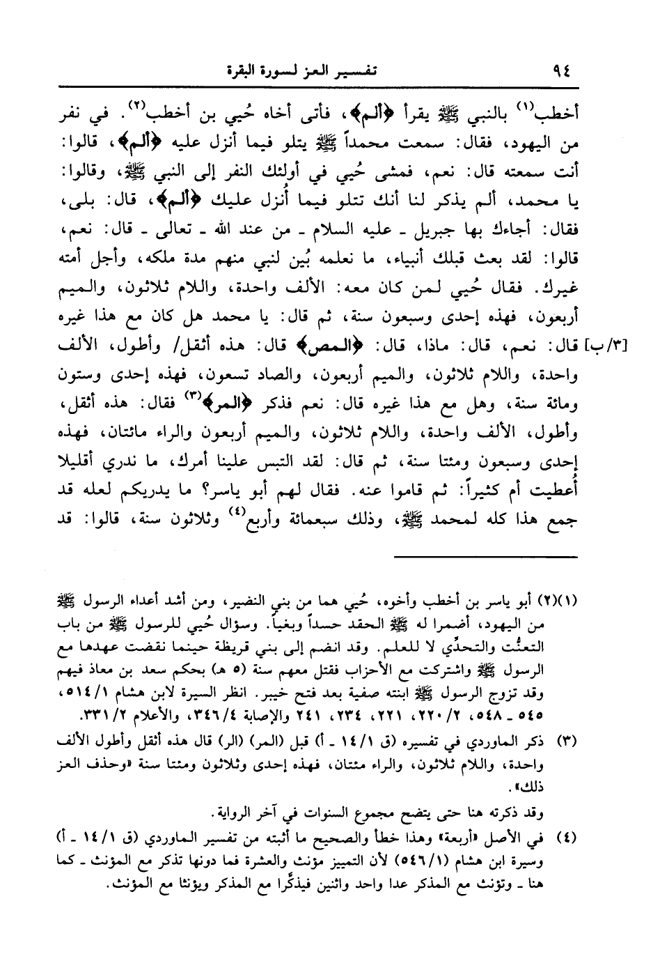أخطب بالنبي صلى الله عليه وسلم يقرأ {الم} ، فأتى أخاه حُيي بن أخطب. في نفر من اليهود، فقال: سمعت محمداً صلى الله عليه وسلم يتلو فيما أُنزل عليه {الم} ، قالوا: أنت سمعته قال: نعم، فمشى حُيي في أولئك النفر إلى النبي صلى الله عليه وسلم، وقالوا: يا محمد، ألم يذكر لنا أنك تتلو فيما أُنزل عليك {الم} ، قال: بلى، فقال: أجاءك بها جبريل - عليه السلام - من عند الله - تعالى - قال: نعم، قالوا: لقد بعث قبلك أنبياء، ما نعلمه بُين لنبي منهم مدة ملكه، وأجل أمته غيرك. فقال حُيي لمن كان معه: الألف واحدة، واللام ثلاثون، والميم أربعون، فهذه إحدى وسبعون سنة، ثم قال: يا محمد هل كان مع هذا غيره [3 / ب] قال: نعم، قال: ماذا، قال: {المص} قال: هذه أثقل / وأطول، الألف واحدة، واللام ثلاثون، والميم أربعون، والصاد تسعون، فهذه إحدى وستون ومائة سنة، وهل مع هذا غيره قال: نعم فذكر {المر} فقال: هذه أثقل، وأطول، الألف واحدة، واللام ثلاثون، والميم أربعون والراء مائتان، فهذه إحدى وسبعون ومئتا سنة، ثم قال: لقد التبس علينا أمرك، ما ندري أقليلاً أُعطيت أم كثيراً: ثم قاموا عنه. فقال لهم أبو ياسر؟ ما يدريكم لعله قد جمع هذا كله لمحمد صلى الله عليه وسلم، وذلك سبعمائة وأربع وثلاثون سنة، قالوا: قد