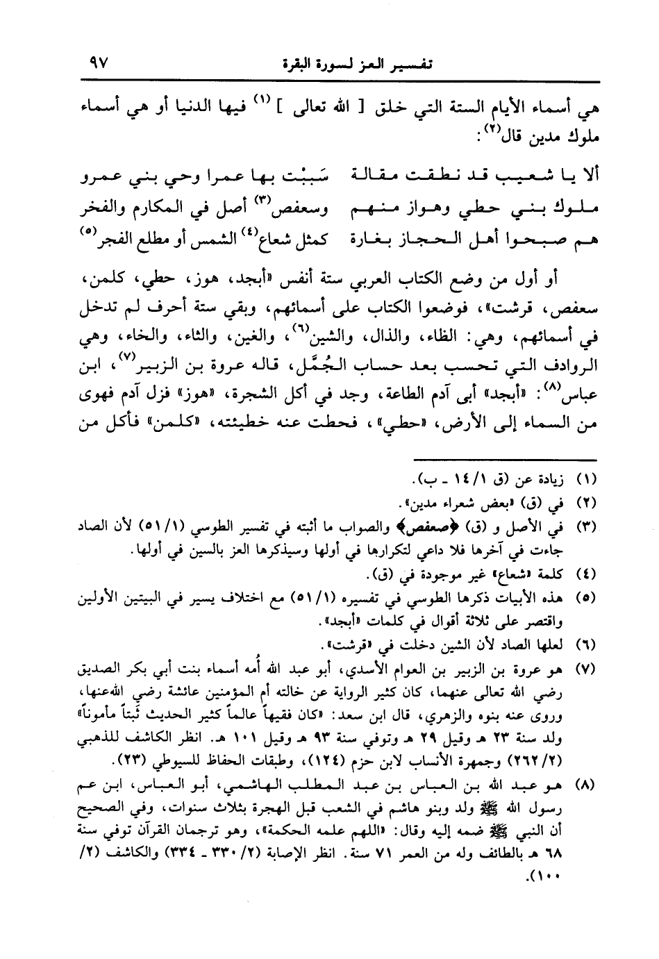 قاله عروة بن الزبير، ابن عباس: " أبجد " أبى آدم الطاعة، وجد في أكل الشجرة، " هوز " فزل آدم فهوى من السماء إلى الأرض، " حطي "، فحطت عنه خطيئته، " كلمن " فأكل من