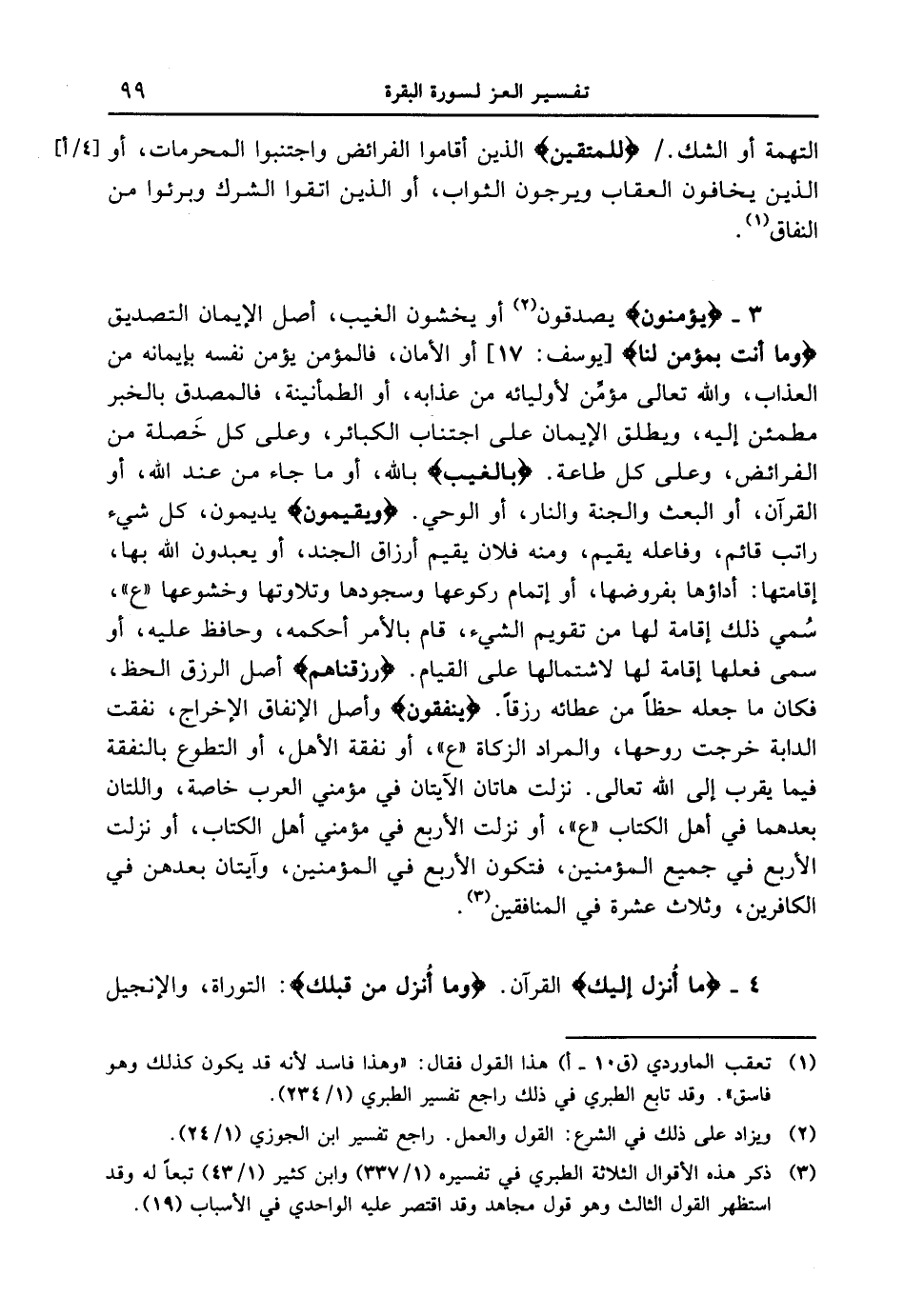 3 - {يُؤْمِنُونَ} {يصدقون أو يخشون الغيب، أصل الإيمان التصديق {وما أنت بمؤمن لنا} } [يوسف: 17] أو الأمان، فالمؤمن يؤمن نفسه بإيمانه من العذاب، والله تعالى مؤمِّن لأوليائه من عذابه، أو الطمأنينة، فالمصدق بالخبر مطمئن إليه، ويُطلق الإيمان على اجتناب الكبائر، وعلى كل خَصلة من الفرائض، وعلى كل طاعة. {بِالْغَيْبِ} {بالله، أو ما جاء من عند الله، أو القرآن، أو البعث والجنة والنار، أو الوحي. {وَيُقِيمُونَ} } يديمون، كل شيء راتب قائم، وفاعله يقيم، ومنه فلان يقيم أرزاق الجند، أو يعبدون الله بها، إقامتها: أداؤها بفروضها، أو إتمام ركوعها وسجودها وتلاوتها وخشوعها " ع "، سُمي ذلك إقامة لها من تقويم الشيء، قام بالأمر أحكمه، وحافظ عليه، أو سمى فعلها إقامة لها لاشتمالها على القيام. {رَزَقْنَاهُمْ} {أصل الرزق الحظ، فكان ما جعله حظاً من عطائه رزقاً. {يُنفِقُونَ} } وأصل الإنفاق الإخراج، نفقت الدابة خرجت روحها، والمراد الزكاة " ع "، أو نفقة الأهل، أو التطوع بالنفقة فيما يقرب إلى الله تعالى. نزلت هاتان الآيتان في مؤمني العرب خاصة، واللتان بعدهما في أهل الكتاب " ع "، أو نزلت الأربع في مؤمني أهل الكتاب، أو نزلت الأربع في جميع المؤمنين، فتكون الأربع في المؤمنين، وآيتان بعدهن في الكافرين، وثلاث عشرة في المنافقين.