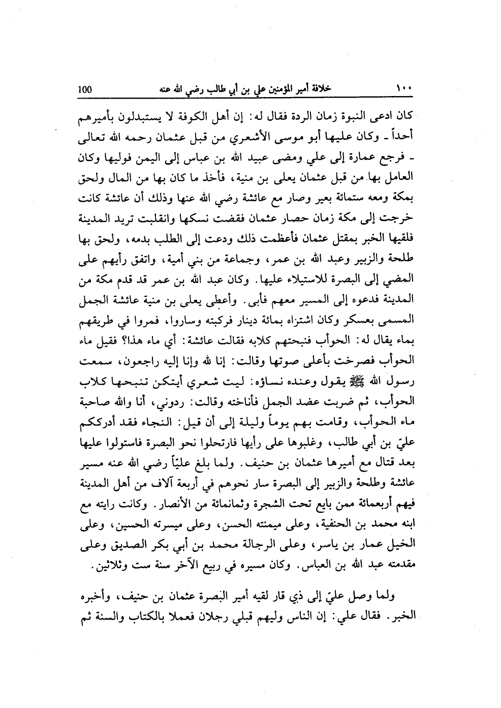 كَانَ ادّعى النُّبُوَّة زمَان الرِّدَّة فَقَالَ لَهُ إِن أهل الْكُوفَة لَا يستبدلون بأميرهم أحدا وَكَانَ عَلَيْهَا أَبُو مُوسَى الْأَشْعَرِيّ من قبل عُثْمَان رَحمَه الله تَعَالَى فَرجع عمَارَة إِلَى عَليّ وَمضى عبيد الله بن عَبَّاس إِلَى الْيمن فوليها وَكَانَ الْعَامِل بهَا من قبل عُثْمَان يعلى بن منية فَأخذ مَا كَانَ بهَا من المَال وَلحق بِمَكَّة وَمَعَهُ سِتّمائَة بعير وَصَارَ مَعَ عَائِشَة رَضِي الله عَنْهَا وَذَلِكَ أَن عَائِشَة كَانَت خرجت إِلَى مَكَّة زمَان حِصَار عُثْمَان فقضت نسكها وانقلبت تُرِيدُ الْمَدِينَة فلقيها الْخَبَر بمقتل عُثْمَان فأعظمت ذَلِك ودعت إِلَى الطّلب بدمه وَلحق بهَا طَلْحَة وَالزُّبَيْر وَعبد الله بن عمر وَجَمَاعَة من بني أُميَّة وَاتفقَ رَأْيهمْ على الْمُضِيّ إِلَى الْبَصْرَة للاستيلاء عَلَيْهَا وَكَانَ عبد الله بن عمر قد قدم مَكَّة من الْمَدِينَة فَدَعوهُ إِلَى الْمسير مَعَهم فَأبى وَأعْطى يعلى بن منية عَائِشَة الْجمل الْمُسَمّى بعسكر وَكَانَ اشْتَرَاهُ بِمِائَة دِينَار فركبته وَسَارُوا فَمروا فِي طريقهم بِمَاء يُقَال لَهُ الحوأب فنبحتهم كلابه فَقَالَت عَائِشَة أَي مَاء هَذَا فَقيل مَاء الحوأب فصرخت بِأَعْلَى صَوتهَا وَقَالَت إِنَّا لله وَإِنَّا إِلَيْهِ رَاجِعُون سَمِعت رَسُول الله صلى الله عَلَيْهِ وَسلم يَقُول وَعِنْده نساؤه لَيْت شعري أيتكن تنبحها كلاب الحوأب ثمَّ ضربت عضد الْجمل فأناخته وَقَالَت ردوني أَنا وَالله صَاحِبَة مَاء الحوأب وَقَامَت بهم يَوْمًا وَلَيْلَة إِلَى أَن قيل النَّجَاء فقد أدرككم عَليّ بن أبي طَالب وغلبوها على رأيها فارتحلوا نَحْو الْبَصْرَة فاستولوا عَلَيْهَا بعد قتال مَعَ أميرها عُثْمَان بن حنيف وَلما بلغ عليا رَضِي الله عَنهُ مسير عَائِشَة وَطَلْحَة وَالزُّبَيْر إِلَى الْبَصْرَة سَار نحوهم فِي أَرْبَعَة آلَاف من أهل الْمَدِينَة فيهم أَرْبَعمِائَة مِمَّن بَايع تَحت الشَّجَرَة وَثَمَانمِائَة من الْأَنْصَار وَكَانَت رايته مَعَ ابْنه مُحَمَّد بن الْحَنَفِيَّة وعَلى ميمنته الْحسن وعَلى ميسرته الْحُسَيْن وعَلى الْخَيل عمار بن يَاسر وعَلى الرجالة مُحَمَّد بن أبي بكر الصّديق وعَلى مقدمته عبد الله بن الْعَبَّاس وَكَانَ مسيره فِي ربيع الآخر سنة سِتّ وَثَلَاثِينَ