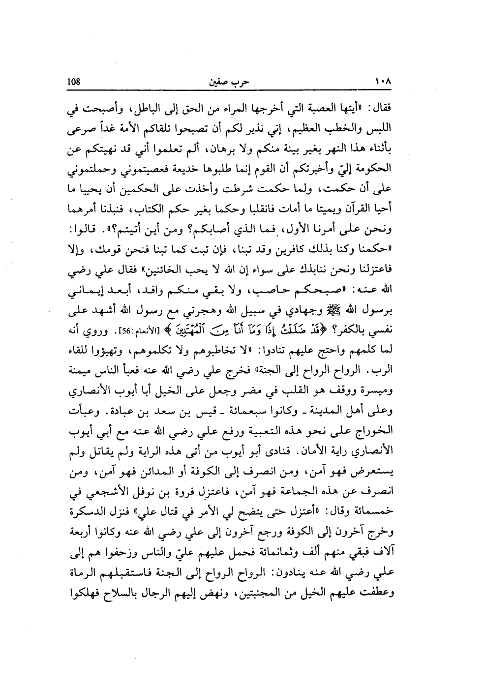 فَقَالَ أيتها الْعصبَة الَّتِي أخرجهَا المراء من الْحق إِلَى الْبَاطِل وأصبحت فِي اللّبْس والخطب الْعَظِيم إِنِّي نَذِير لكم أَن تصبحوا تلقاكم الْأمة غَدا صرعى بأثناء هَذَا النَّهر بِغَيْر بَيِّنَة مِنْكُم وَلَا برهَان ألم تعلمُوا أَنِّي قد نَهَيْتُكُمْ عَن الْحُكُومَة إِلَيّ وأخبرتكم أَن الْقَوْم إِنَّمَا طلبوها خديعة فعصيتموني وحملتموني على أَن حكمت وَلما حكمت شرطت وَأخذت على الْحكمَيْنِ أَن يحيى يَا مَا أَحْيَا الْقُرْآن ويميتا مَا أمات فانقلبا وَحكما بِغَيْر حكم الْكتاب فنبذنا أَمرهمَا وَنحن على أمرنَا الأول فَمَا الَّذِي أَصَابَكُم وَمن أَيْن أتيتم قَالُوا حكمنَا وَكُنَّا بذلك كَافِرين وَقد تبنا فَإِن تبت كَمَا تبنا فَنحْن قَوْمك وَإِلَّا فاعتزلنا وَنحن ننابذك على سَوَاء إِن الله لَا يحب الخائنين فَقَالَ عَليّ رَضِي الله عَنهُ صبحكم صَاحب وَلَا بَقِي مِنْكُم وَافد أبعد إيماني برَسُول الله صلى الله عَلَيْهِ وَسلم وجهادي فِي سَبِيل الله وهجرتي مَعَ رَسُول الله أشهد على نَفسِي بالْكفْر {قد ضللت إِذا وَمَا أَنا من المهتدين} وَرُوِيَ أَنه لما كَلمهمْ وَاحْتج عَلَيْهِم تنادوا لَا تخاطبوهم وَلَا تكلموهم وتهيؤوا للقاء الرب الرواح الرواح إِلَى الْجنَّة فَخرج عَليّ رَضِي الله عَنهُ فعبأ النَّاس ميمنة وميسرة ووقف هُوَ فِي الْقلب فِي مُضر وَجعل على الْخَيل ابا أَيُّوب الْأنْصَارِيّ وعَلى أهل الْمَدِينَة وَكَانُوا سَبْعمِائة قيس بن سعد بن عبَادَة وعبأت الْخَوَارِج على نَحْو هَذِه التعبية وَرفع عَليّ رَضِي الله عَنهُ مَعَ أبي أَيُّوب الْأنْصَارِيّ راية الْأمان فَنَادَى أَبُو أَيُّوب من أَتَى هَذِه الرَّايَة وَلم يُقَاتل وَلم يستعرض فَهُوَ آمن وَمن انْصَرف إِلَى الْكُوفَة أَو الْمَدَائِن فَهُوَ آمن وَمن انْصَرف عَن هَذِه الْجَمَاعَة فَهُوَ آمن فاعتزل فَرْوَة بن نَوْفَل الْأَشْجَعِيّ فِي خَمْسمِائَة وَقَالَ أعتزل حَتَّى يَتَّضِح لي الْأَمر فِي قتال عَليّ فَنزل الدسكرة وَخرج آخَرُونَ إِلَى الْكُوفَة وَرجع آخَرُونَ إِلَى عَليّ رَضِي الله عَنهُ وَكَانُوا أَرْبَعَة آلَاف فَبَقيَ مِنْهُم ألف وَثَمَانمِائَة فَحمل عَلَيْهِم عَليّ وَالنَّاس وزحفوا هم إِلَى عَليّ رَضِي الله عَنهُ ينادون الرواح الرواح إِلَى الْجنَّة فَاسْتَقْبَلَهُمْ الرُّمَاة وعطفت عَلَيْهِم الْخَيل من المجنبتين ونهض إِلَيْهِم الرِّجَال بِالسِّلَاحِ فهلكوا