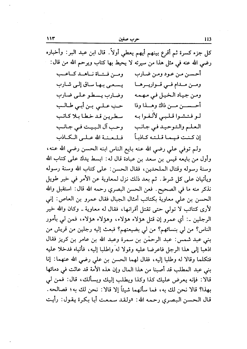 وَلما توفّي عَليّ رَضِي الله عَنهُ بَايع النَّاس ابْنه الْحسن رَضِي الله عَنهُ وَأول من بَايعه قيس بن سعد بن عبَادَة قَالَ لَهُ ابْسُطْ يدك على كتاب الله وَسنة رَسُوله وقتال الْمُلْحِدِينَ فَقَالَ الْحسن على كتاب الله وَسنة رَسُوله ويأتيان على كل شَرط ثمَّ بعد ذَلِك نزل لمعاوية عَن الْأَمر فِي خبر طَوِيل نذْكر مِنْهُ مَا فِي الصَّحِيح فَعَن الْحسن الْبَصْرِيّ رَحمَه الله قَالَ اسْتقْبل وَالله الْحسن بن عَليّ مُعَاوِيَة بكتائب أَمْثَال الْجبَال فَقَالَ عَمْرو بن الْعَاصِ إِنِّي لأرى كتائب لَا تولي حَتَّى تقتل أقرانها فَقَالَ لَهُ مُعَاوِيَة وَكَانَ وَالله خير الرجلَيْن أَي عَمْرو إِن قتل هَؤُلَاءِ هَؤُلَاءِ وَهَؤُلَاء هَؤُلَاءِ فَمن لي بِأُمُور النَّاس من لي بنسائهم من لي بضيعتهم فَبعث إِلَيْهِ رجلَيْنِ من قُرَيْش من بني عبد شمس عبد الرَّحْمَن بن سَمُرَة وَعبد الله بن عَامر بن كريز فَقَالَ اذْهَبَا إِلَى هَذَا الرجل فاعرضا عَلَيْهِ وقولا لَهُ واطلبا إِلَيْهِ فَأتيَاهُ فدخلا عَلَيْهِ فتكلما وَقَالا لَهُ وطلبا إِلَيْهِ فَقَالَ لَهما الْحسن بن عَليّ رَضِي الله عَنْهُمَا إِنَّا بني عبد الْمطلب قد أصبْنَا من هَذَا المَال وَإِن هَذِه الْأمة قد عاثت فِي دمائها قَالَا فَإِنَّهُ يعرض عَلَيْك كَذَا وَكَذَا وَيطْلب إِلَيْك ويسألك قَالَ فَمن لي بِهَذَا قَالَا نَحن لَك بِهِ فَمَا سَأَلَهُمَا شَيْئا إِلَّا قَالَا نَحن لَك بِهِ فَصَالحه قَالَ الْحسن الْبَصْرِيّ رَحمَه الله وَلَقَد سَمِعت أَبَا بكرَة يَقُول رَأَيْت