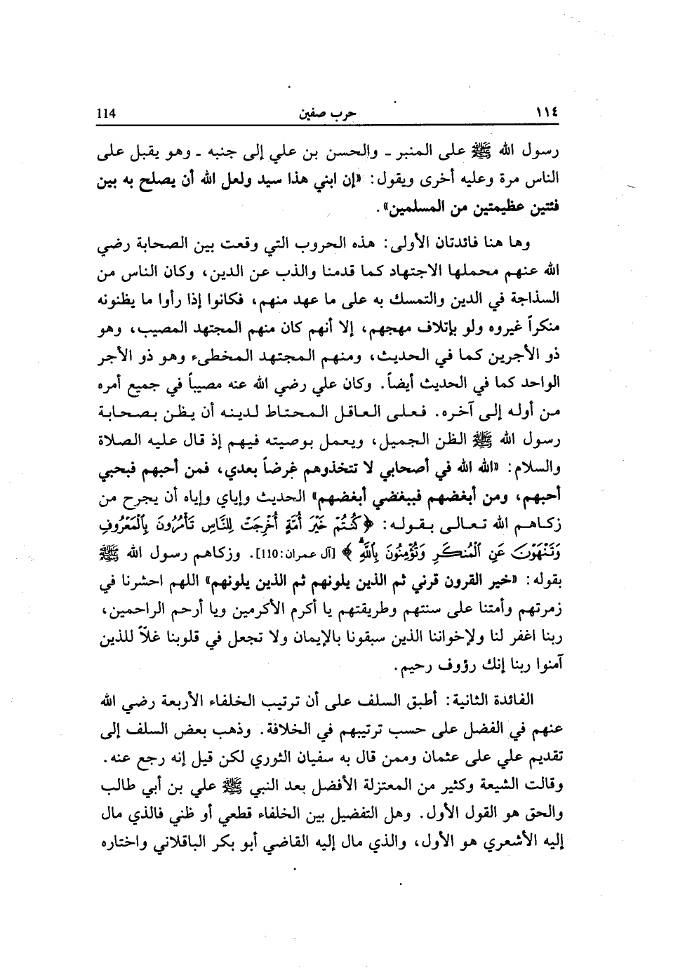 وَهَا هُنَا فَائِدَتَانِ الأولى هَذِه الحروب الَّتِي وَقعت بَين الصَّحَابَة رَضِي الله عَنْهُم محملها الإجتهاد كَمَا قدمنَا والذب عَن الدّين وَكَانَ النَّاس من السذاجة فِي الدّين والتمسك بِهِ على مَا عهد مِنْهُم فَكَانُوا إِذا رَأَوْا مَا يَظُنُّونَهُ مُنْكرا غيروه وَلَو بِإِتْلَاف مهجهم إِلَّا أَنهم كَانَ مِنْهُم الْمُجْتَهد الْمُصِيب وَهُوَ ذُو الأجرين كَمَا فِي الحَدِيث وَمِنْهُم الْمُجْتَهد المخطىء وَهُوَ ذُو الْأجر الْوَاحِد كَمَا فِي الحَدِيث أَيْضا وَكَانَ عَليّ رَضِي الله عَنهُ مصيبا فِي جَمِيع أمره من أَوله إِلَى آخِره فعلى الْعَاقِل المحتاط لدينِهِ أَن يظنّ بصحابة رَسُول الله صلى الله عَلَيْهِ وَسلم الظَّن الْجَمِيل وَيعْمل بوصيته فيهم إِذْ قَالَ عَلَيْهِ الصَّلَاة وَالسَّلَام (الله الله فِي أَصْحَابِي لَا تتخذوهم غَرضا بعدِي فَمن أحبهم فبحبي أحبهم وَمن أبْغضهُم فببغضي أبْغضهُم) الحَدِيث وإياي وإياه أَن يجرح من زكاهم الله تَعَالَى بقوله {كُنْتُم خير أمة أخرجت للنَّاس تأمرون بِالْمَعْرُوفِ وتنهون عَن الْمُنكر وتؤمنون بِاللَّه} وزكاهم رَسُول الله صلى الله عَلَيْهِ وَسلم زمرتهم وأمتنا على سنتهمْ وطريقتهم يَا أكْرم الأكرمين وَيَا أرْحم الرَّاحِمِينَ رَبنَا اغْفِر لنا وَلِإِخْوَانِنَا الَّذين سبقُونَا بِالْإِيمَان وَلَا تجْعَل فِي قُلُوبنَا غلا للَّذين آمنُوا رَبنَا إِنَّك رؤوف رَحِيم