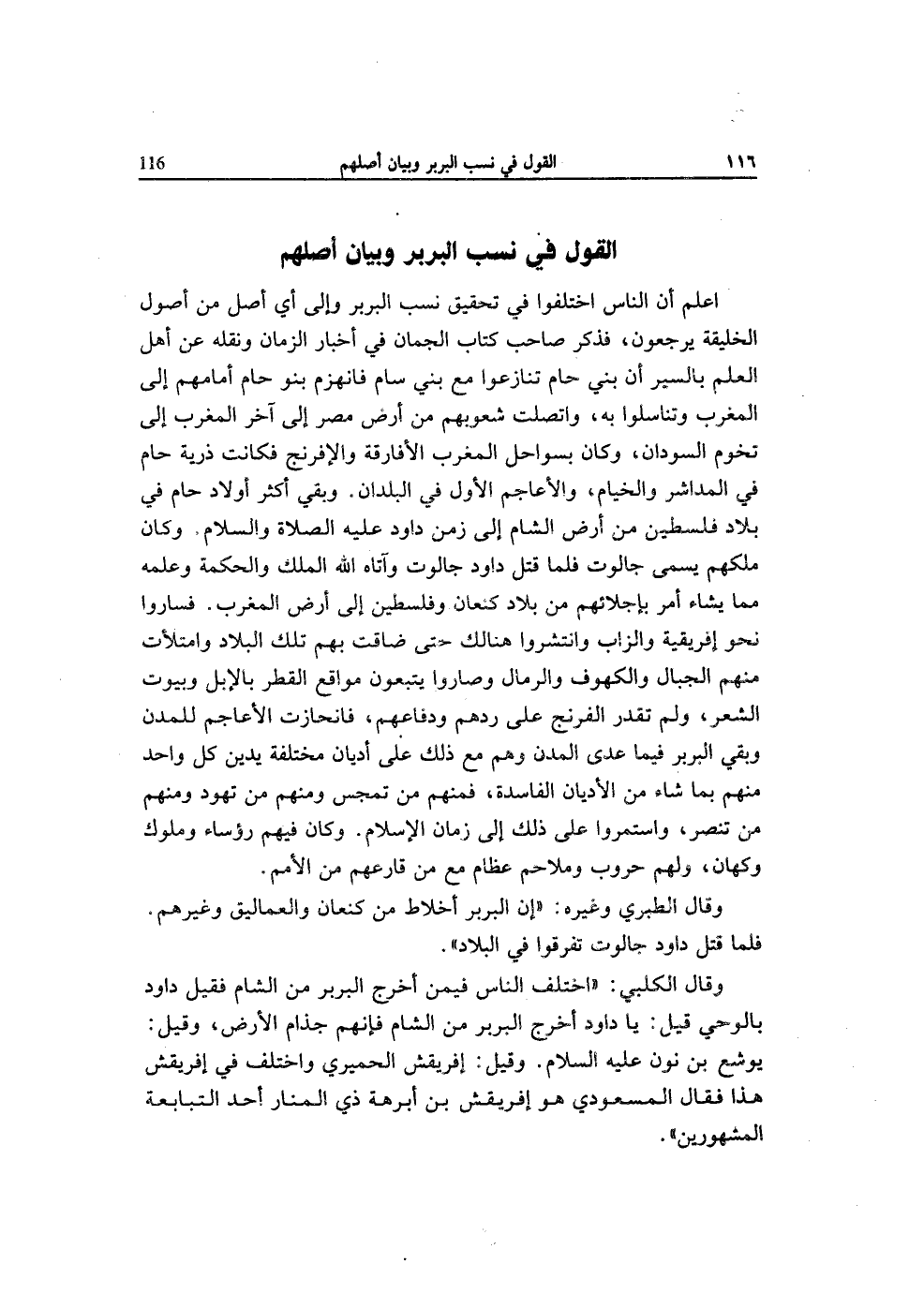 أعلم أَن النَّاس اخْتلفُوا فِي تَحْقِيق نسب البربر وَإِلَى أَي اصل من أصُول الخليقة يرجعُونَ فَذكر صَاحب كتاب الجمان فِي أَخْبَار الزَّمَان وَنَقله عَن أهل الْعلم بالسير أَن بني حام تنازعوا مَعَ بني سَام فَانْهَزَمَ بَنو حام أمامهم إِلَى الْمغرب وتناسلوا بِهِ واتصلت شعوبهم من أَرض مصر إِلَى آخر الْمغرب إِلَى تخوم السودَان وَكَانَ بسواحل الْمغرب الأفارقة والإفرنج فَكَانَت ذُرِّيَّة حام فِي المداشر والخيام والأعاجم الأول فِي الْبلدَانِ وَبَقِي أَكثر أَوْلَاد حام فِي بِلَاد فلسطين من أَرض الشَّام إِلَى زمن دَاوُد عَلَيْهِ الصَّلَاة وَالسَّلَام وَكَانَ ملكهم يُسمى جالوت فَلَمَّا قتل دَاوُد جالوت وآتاه الله الْملك وَالْحكمَة وَعلمه مِمَّا يَشَاء أَمر بإجلائهم من بِلَاد كنعان وفلسطين إِلَى أَرض الْمغرب فَسَارُوا نَحْو إفريقية والزاب وانتشروا هُنَالك حَتَّى ضَاقَتْ بهم تِلْكَ الْبِلَاد وامتلأت مِنْهُم الْجبَال والكهوف والرمال وصاروا يتبعُون مواقع الْقطر بِالْإِبِلِ وبيوت الشّعْر وَلم تقدر الفرنج على ردهم ودفاعهم فانحازت الْأَعَاجِم للمدن وَبَقِي البربر فِيمَا عدى المدن وهم مَعَ ذَلِك على أَدْيَان مُخْتَلفَة يدين كل وَاحِد مِنْهُم بِمَا شَاءَ من الْأَدْيَان الْفَاسِدَة فَمنهمْ من تمجس وَمِنْهُم من تهود وَمِنْهُم من تنصر واستمروا على ذَلِك إِلَى زمَان الْإِسْلَام وَكَانَ فيهم رُؤَسَاء وملوك وكهان وَلَهُم حروب وملاحم عِظَام مَعَ من قارعهم من الْأُمَم
