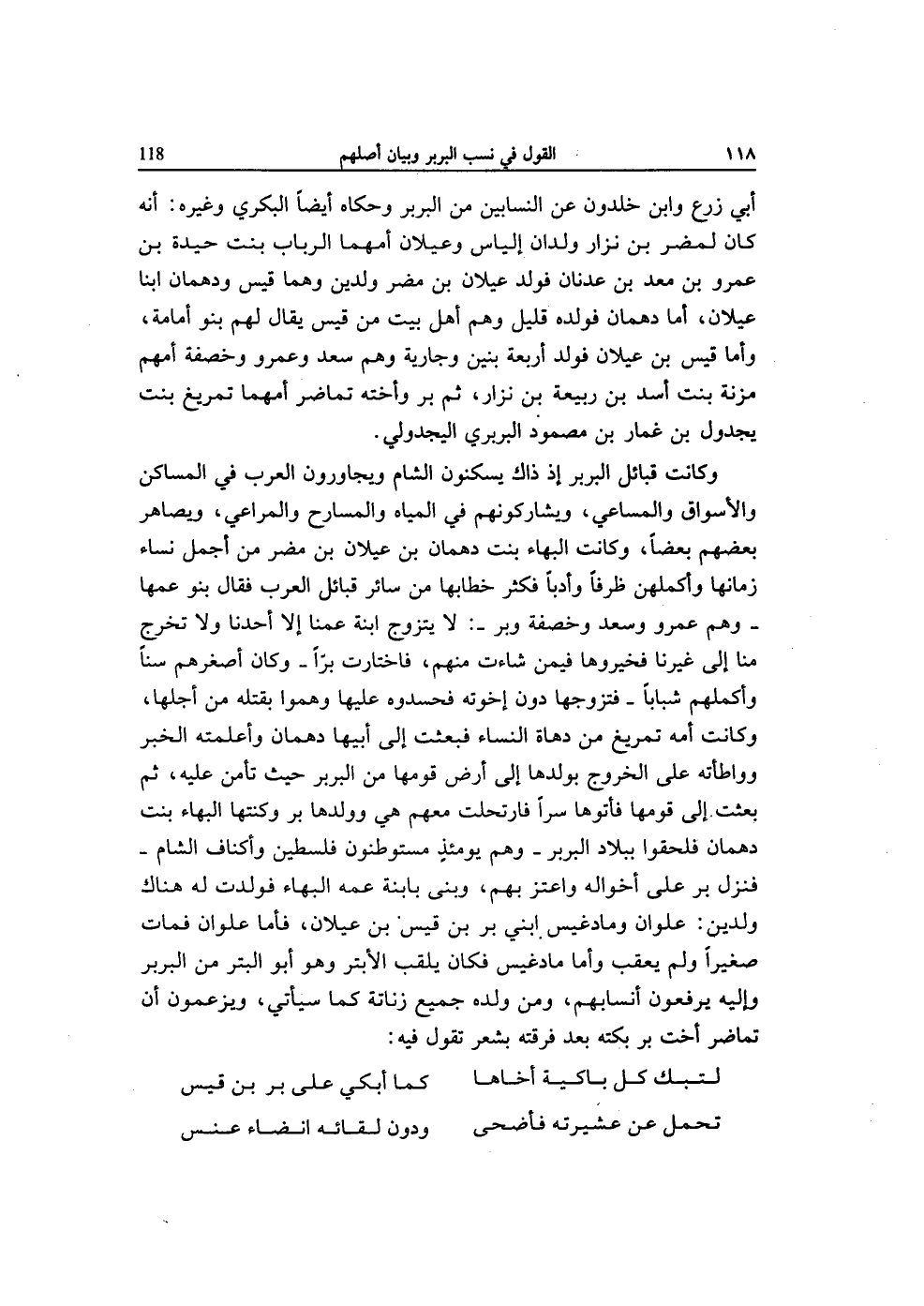 وَكَانَت قبائل البربر إِذْ ذَاك يسكنون الشَّام ويجاورون الْعَرَب فِي المساكن والأسواق والمساعي ويشاركونهم فِي الْمِيَاه والمسارح والمراعي ويصاهر بَعضهم بَعْضًا وَكَانَت الْبَهَاء بنت دهمان بن عيلان بن مُضر من أجمل نسَاء زمانها وأكملهن ظرفا وأدبا فَكثر خطابها من سَائِر قبائل الْعَرَب فَقَالَ بَنو عَمها وهم عَمْرو وَسعد وخصفة وبر لَا يتَزَوَّج ابْنة عمنَا إِلَّا أَحَدنَا وَلَا تخرج منا إِلَى غَيرنَا فخيروها فِيمَن شَاءَت مِنْهُم فَاخْتَارَتْ برا وَكَانَ أَصْغَرهم سنا وأكملهم شبَابًا فَتَزَوجهَا دون اخوته فحسدوه عَلَيْهَا وهموا بقتْله من أجلهَا وَكَانَت أمه تمريغ من دهاة النِّسَاء فَبعثت إِلَى أَبِيهَا دهمان وأعلمته الْخَبَر وواطأته على الْخُرُوج بِوَلَدِهَا إِلَى أَرض قَومهَا من البربر حَيْثُ تأمن عَلَيْهِ ثمَّ بعثت إِلَى قَومهَا فأتوها سرا فارتحلت مَعَهم هِيَ وَوَلدهَا بر وكنتها الْبَهَاء بنت دهمان فَلَحقُوا بِبِلَاد البربر وهم يَوْمئِذٍ مستوطنون فلسطين وأكناف الشَّام فَنزل بر على أَخْوَاله واعتز بهم وَبنى بابنة عَمه الْبَهَاء فَولدت لَهُ هُنَاكَ وَلدين علوان ومادغيس ابْني بر بن قيس بن عيلان فَأَما علوان فَمَاتَ صَغِيرا وَلم يعقب وَأما مادغيس فَكَانَ يلقب الأبتر وَهُوَ أَبُو البتر من البربر وَإِلَيْهِ يرفعون أنسابهم وَمن وَلَده جَمِيع زناته كَمَا سَيَأْتِي ويزعمون أَن تماضر أُخْت بر بكته بعد فرقته بِشعر تَقول فِيهِ