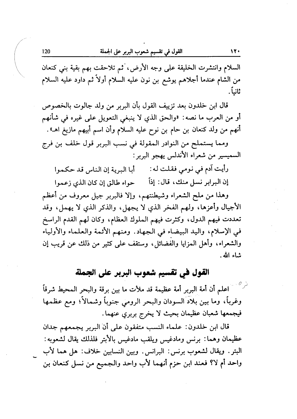 اعْلَم أَن أمة البربر أمة عَظِيمَة قد مَلَأت مَا بَين برقة وَالْبَحْر الْمُحِيط شرقا وغربا وَمَا بَين بِلَاد السودَان وَالْبَحْر الرُّومِي جنوبا وَشمَالًا وَمَعَ عظمها فيجمعها شعْبَان عظيمان بِحَيْثُ لَا يخرج بربري عَنْهُمَا