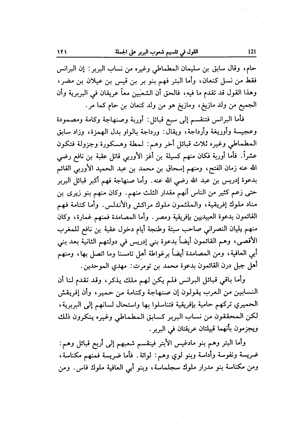 وَأما بَاقِي قبائل البرانس فَلم يكن لَهُم ملك يذكر وَقد تقدم لنا أَن النسابين من الْعَرَب يَقُولُونَ إِن صنهاجة وكتامة من حمير وَأَن إفريقش الْحِمْيَرِي تَركهم حامية بإفريقية فتناسلوا بهَا واستحال لسانهم إِلَى البربرية لَكِن الْمُحَقِّقُونَ من نساب البربر كسابق المطماطي وَغَيره يُنكرُونَ ذَلِك ويجزمون بِأَنَّهُمَا قبيلتان عريقتان فِي البربر وَأما البتر وهم بَنو مادغيس الأبتر فينقسم شِعْبهمْ إِلَى أَربع قبائل وهم ضريسة ونفوسة وأداسة وَبَنُو لوي وهم لواتة فَأَما ضريسة فَمنهمْ مكناسة وَمن مكناسة بَنو مدرار مُلُوك سجلماسة وَبَنُو أبي الْعَافِيَة مُلُوك فاس وَمن