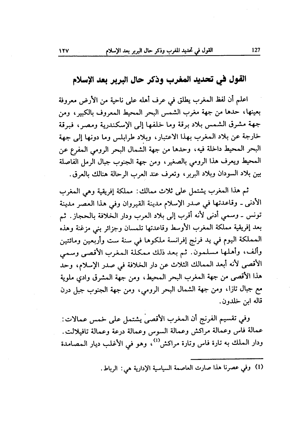 ثمَّ هَذَا الْمغرب يشْتَمل على ثَلَاث ممالك مملكة إفريقية وَهِي الْمغرب الْأَدْنَى وقاعدتها فِي صدر الْإِسْلَام مَدِينَة القيروان وَفِي هَذَا الْعَصْر مَدِينَة تونس وَسمي أدنى لِأَنَّهُ أقرب إِلَى بِلَاد الْعَرَب وَدَار الْخلَافَة بالحجاز ثمَّ بعد إفريقية مملكة الْمغرب الْأَوْسَط وقاعدتها تلمسان وجزائر بني مزغنة وَهَذِه المملكة الْيَوْم فِي يَد فرنج إفرانسة ملكوها فِي سنة سِتّ وَأَرْبَعين وَمِائَتَيْنِ وَألف وَأَهْلهَا مُسلمُونَ ثمَّ بعد ذَلِك مملكة الْمغرب الْأَقْصَى وَسمي الْأَقْصَى لِأَنَّهُ أبعد الممالك الثَّلَاث عَن دَار الْخلَافَة فِي صدر الْإِسْلَام وحد هَذَا الْأَقْصَى من جِهَة الْمغرب الْبَحْر الْمُحِيط وَمن جِهَة الْمشرق وَادي ملوية مَعَ جبال تازا وَمن جِهَة الشمَال الْبَحْر الرُّومِي وَمن جِهَة الْجنُوب جبل درن قَالَه ابْن خلدون