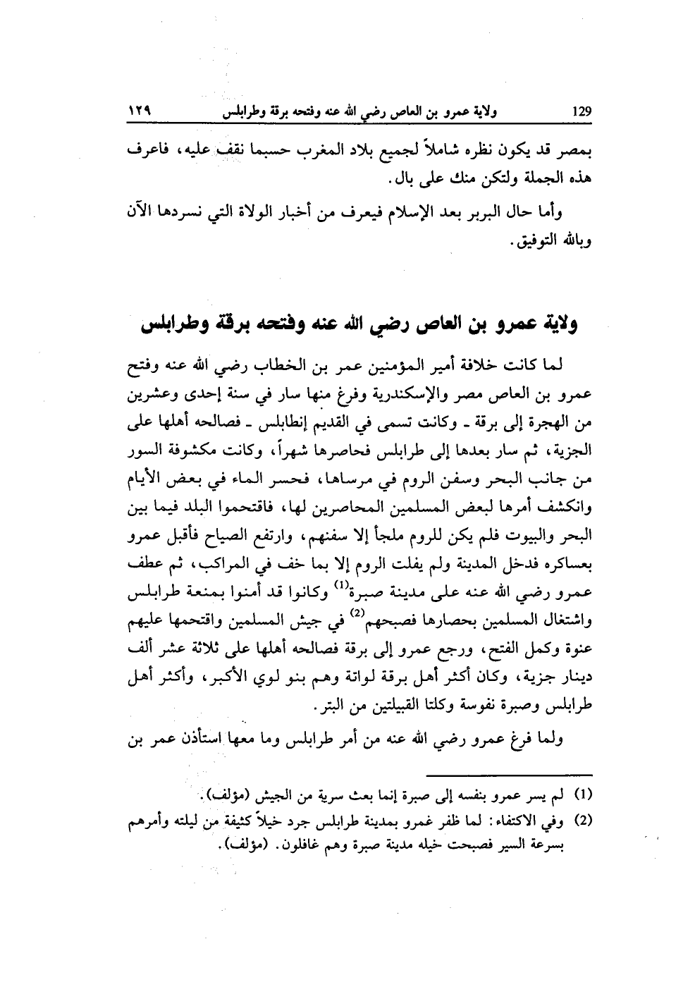 لما كَانَت خلَافَة أَمِير الْمُؤمنِينَ عمر بن الْخطاب رَضِي الله عَنهُ وَفتح عَمْرو بن الْعَاصِ مصر والإسكندرية وَفرغ مِنْهَا سَار فِي سنة إِحْدَى وَعشْرين من الْهِجْرَة إِلَى برقة وَكَانَت تسمى فِي الْقَدِيم إنطابلس فَصَالحه أَهلهَا على الْجِزْيَة ثمَّ سَار بعْدهَا إِلَى طرابلس فحاصرها شهرا وَكَانَت مكشوفة السُّور من جَانب الْبَحْر وسفن الرّوم فِي مرْسَاها فحسر المَاء فِي بعض الْأَيَّام وانكشف أمرهَا لبَعض الْمُسلمين المحاصرين لَهَا فاقتحموا الْبَلَد فِيمَا بَين الْبَحْر والبيوت فَلم يكن للروم ملْجأ إِلَّا سفنهم وارتفع الصياح فَأقبل عَمْرو بعساكره فَدخل الْمَدِينَة وَلم يفلت الرّوم إِلَّا بِمَا خف فِي المراكب ثمَّ عطف عَمْرو رَضِي الله عَنهُ على مَدِينَة صبرَة وَكَانُوا قد أمنُوا بمنعة طرابلس واشتغال الْمُسلمين بحصارها فصبحهم فِي جَيش الْمُسلمين واقتحمها عَلَيْهِم عنْوَة وكمل الْفَتْح وَرجع عَمْرو إِلَى برقة فَصَالحه أَهلهَا على ثَلَاثَة عشر ألف دِينَار جِزْيَة وَكَانَ أَكثر أهل برقة لواته وهم بَنو لوي الْأَكْبَر وَأكْثر أهل طرابلس وصبرة نفوسة وكلتا القبيلتين من البتر