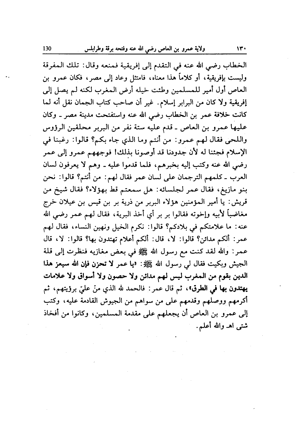 الْخطاب رَضِي الله عَنهُ فِي التَّقَدُّم إِلَى إفريقية فَمَنعه وَقَالَ تِلْكَ المفرقة وَلَيْسَت بإفريقية أَو كلَاما هَذَا مَعْنَاهُ فامتثل وَعَاد إِلَى مصر فَكَانَ عَمْرو بن الْعَاصِ أول أَمِير للْمُسلمين وطِئت خيله أَرض الْمغرب لكنه لم يصل إِلَى إفريقية وَلَا كَانَ من البرابر إِسْلَام غير أَن صَاحب كتاب الجمان نقل أَنه لما كَانَت خلَافَة عمر بن الْخطاب رَضِي الله عَنهُ واستفتحت مَدِينَة مصر وَكَانَ عَلَيْهَا عَمْرو بن الْعَاصِ قدم عَلَيْهِ سِتَّة نفر من البربر مُحَلِّقِينَ الرؤوس واللحى فَقَالَ لَهُم عَمْرو من أَنْتُم وَمَا الَّذِي جَاءَ بكم قَالُوا رغبنا فِي الْإِسْلَام فَجِئْنَا لَهُ لِأَن جدودنا قد أوصونا بذلك فوجههم عَمْرو إِلَى عمر رَضِي الله عَنهُ وَكتب إِلَيْهِ بخبرهم فَلَمَّا قدمُوا عَلَيْهِ وهم لَا يعْرفُونَ لِسَان الْعَرَب كَلمهمْ الترجمان على لِسَان عمر فَقَالَ لَهُم من أَنْتُم قَالُوا نَحن بَنو مازيغ فَقَالَ عمر لجلسائه هَل سَمِعْتُمْ قطّ بهؤلاء فَقَالَ شيخ من قُرَيْش يَا أَمِير الْمُؤمنِينَ هَؤُلَاءِ البربر من ذُرِّيَّة بر بن قيس بن عيلان خرج مغاضبا لِأَبِيهِ وَإِخْوَته فَقَالُوا بر بر أَي أَخذ الْبَريَّة فَقَالَ لَهُم عمر رَضِي الله عَنهُ مَا علامتكم فِي بِلَادكُمْ قَالُوا نكرم الْخَيل ونهين النِّسَاء فَقَالَ لَهُم عمر ألكم مَدَائِن قَالُوا لَا قَالَ ألكم أَعْلَام تهتدون بهَا قَالُوا لَا قَالَ عمر وَالله لقد كنت مَعَ رَسُول الله صلى الله عَلَيْهِ وَسلم فِي بعض مغازيه فَنَظَرت إِلَى قلَّة الْجَيْش وبكيت فَقَالَ لي رَسُول الله صلى الله عَلَيْهِ وَسلم (يَا عمر لَا تحزن فَإِن الله سيعز هَذَا الدّين بِقوم من الْمغرب لَيْسَ لَهُم مَدَائِن وَلَا حصون وَلَا أسواق وَلَا عَلَامَات يَهْتَدُونَ بهَا فِي الطّرق) ثمَّ قَالَ عمر فَالْحَمْد لله الَّذِي من عَليّ برؤيتهم ثمَّ أكْرمهم ووصلهم وَقَدَّمَهُمْ على من سواهُم من الجيوش القادمة عَلَيْهِ وَكتب إِلَى عَمْرو بن الْعَاصِ أَن يجعلهم على مُقَدّمَة الْمُسلمين وَكَانُوا من أفخاذ شَتَّى اه وَالله أعلم