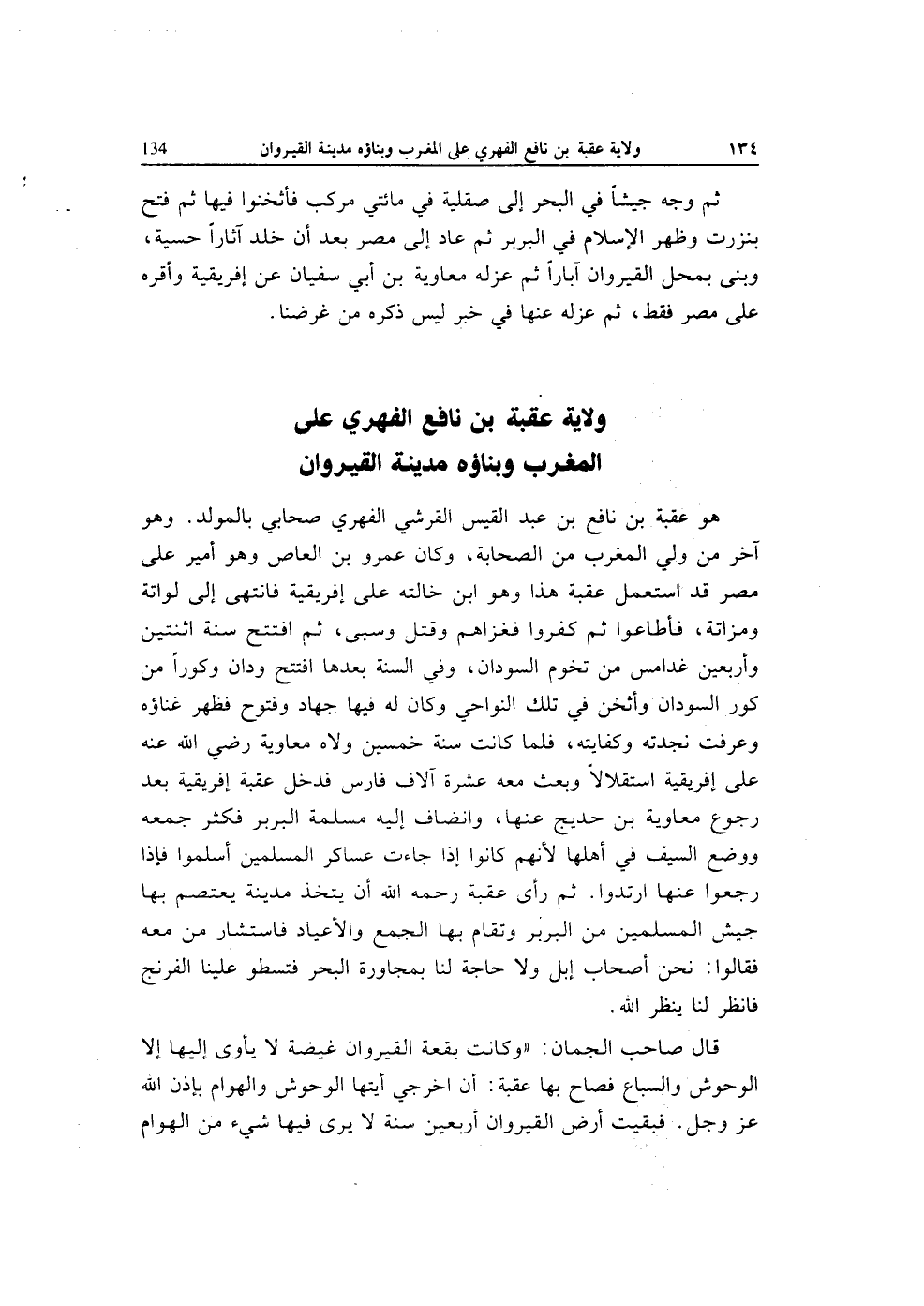 هُوَ عقبَة بن نَافِع بن عبد الْقَيْس الْقرشِي الفِهري صَحَابِيّ بالمولد وَهُوَ آخر من ولي الْمغرب من الصَّحَابَة وَكَانَ عَمْرو بن الْعَاصِ وَهُوَ أَمِير على مصر قد اسْتعْمل عقبَة هَذَا وَهُوَ ابْن خَالَته على إفريقية فَانْتهى إِلَى لواتة ومزاتة فأطاعوا ثمَّ كفرُوا فغزاهم وَقتل وسبى ثمَّ افْتتح سنة اثْنَتَيْنِ وَأَرْبَعين غدامس من تخوم السودَان وَفِي السّنة بعْدهَا افْتتح ودان وكورا من كور السودَان وأثخن فِي تِلْكَ النواحي وَكَانَ لَهُ فِيهَا جِهَاد وفتوح فَظهر غناؤه وَعرفت نجدته وكفايته فَلَمَّا كَانَت سنة خمسين ولاه مُعَاوِيَة رَضِي الله عَنهُ على إفريقية اسْتِقْلَالا وَبعث مَعَه عشرَة آلَاف فَارس فَدخل عقبَة إفريقية بعد رُجُوع مُعَاوِيَة بن حديج عَنْهَا وانضاف إِلَيْهِ مسلمة البربر فَكثر جمعه وَوضع السَّيْف فِي أَهلهَا لأَنهم كَانُوا إِذا جَاءَت عَسَاكِر الْمُسلمين أَسْلمُوا فَإِذا رجعُوا عَنْهَا ارْتَدُّوا ثمَّ رأى عقبَة رَحمَه الله أَن يتَّخذ مَدِينَة يعتصم بهَا جَيش الْمُسلمين من البربر وتقام بهَا الْجَمِيع والأعياد فَاسْتَشَارَ من مَعَه فَقَالُوا نَحن أَصْحَاب إبل وَلَا حَاجَة لنا بمجاورة الْبَحْر فتسطو علينا الفرنج فَانْظُر لنا ينظر الله